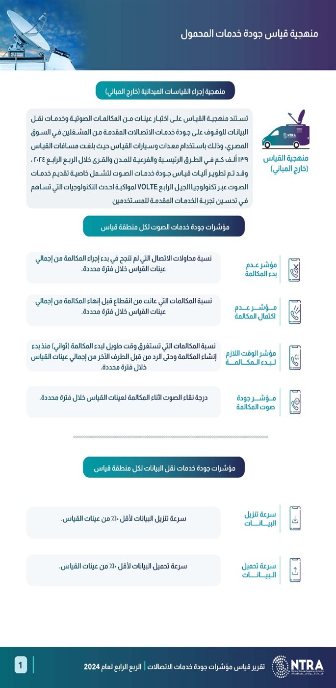 وبلغت مسافات القياس 139 ألف كم في الطرق الرئيسية والفرعية للمدن والقرى خلال الربع الرابع لعام 2024، وقد تم تطوير آليات قياس جودة خدمات الصوت لتشمل خاصية تقديم خدمات الصوت عبر تكنولوجيا الجيل الرابع VOLTE لمواكبة أحدث التكنولوجيات التي تساهم في تحسين تجربة الخدمات المقدمة للمستخدمين.