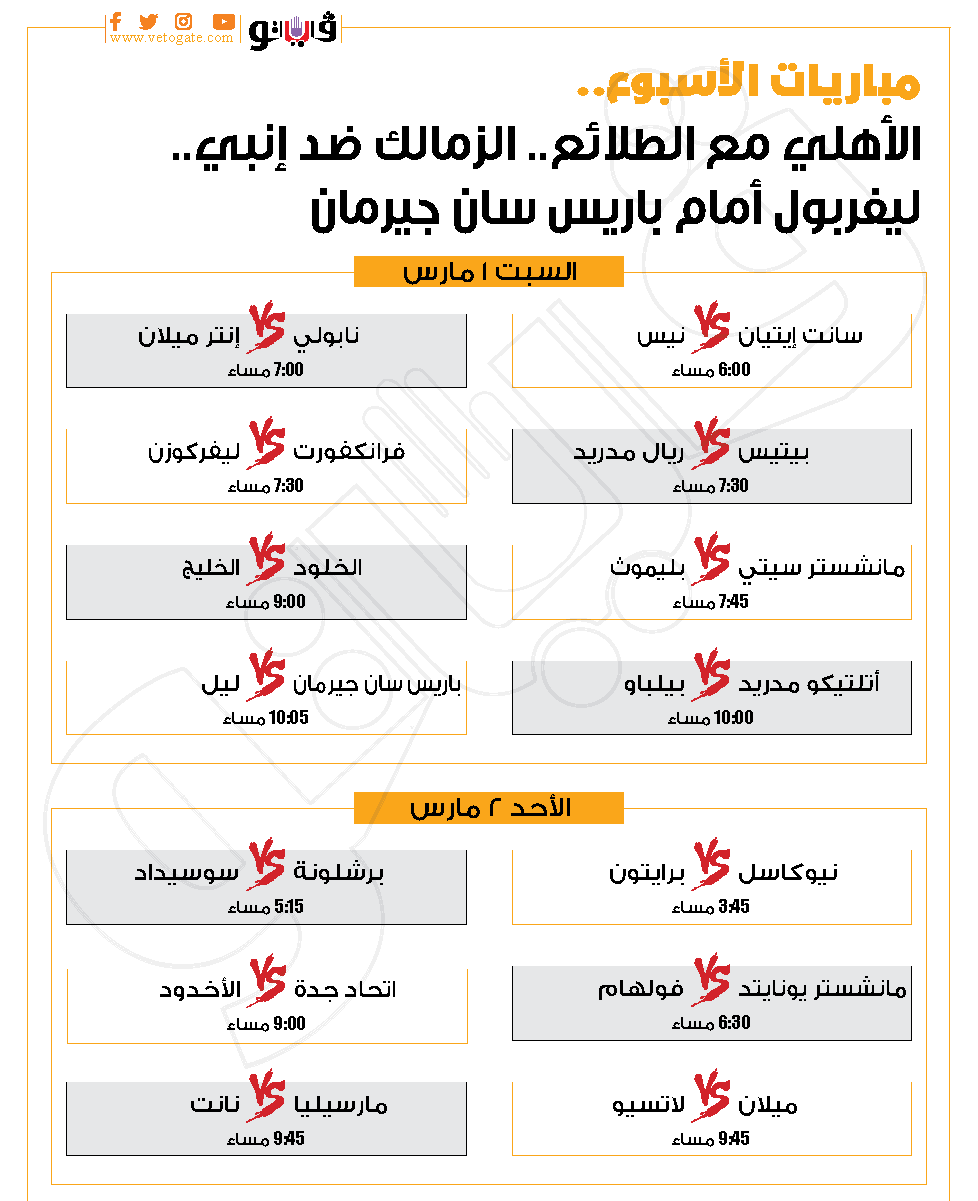 مباريات الأسبوع، الأهلي مع الطلائع.. الزمالك ضد إنبي.. ليفربول أمام باريس سان جيرمان (إنفوجراف)