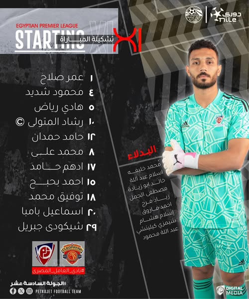 أعلن سيد عيد مدرب فريق بتروجيت تشكيل فريقه لمواجهة نظيره سيراميكا كليوباترا للمباراة المقرر لها اليوم في الأسبوع الـ ١٦ من بطولة الدوري الممتاز.