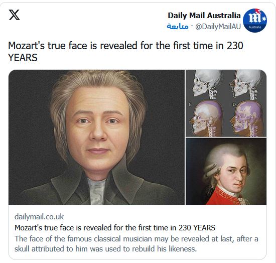 موزارت، نجح فريق من العلماء من إعادة بناء وجه الموسيقار الشهير فولفجانج أماديوس موزارت، باستخدام جمجمة يعتقد أنها تعود إليه، في محاولة لحل اللغز الذي طالما أحاط بمظهره الحقيقي.