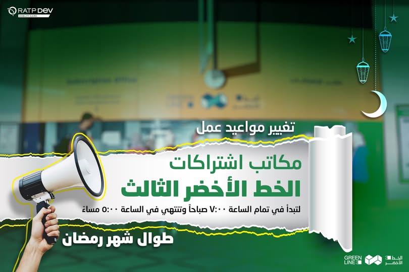 وجاء نص إعلان الشركة كما يلى: "تغيير مواعيد عمل مكاتب الاشتراكات مؤقتًا طوال شهر رمضان الكريم بمحطات كلية البنات، عبده باشا، عدلي منصور، النزهة، هليوبوليس، العباسية، العتبة، ناصر، صفاء حجازي، امبابة، القومية، وادي النيل، جامعة الدول وجامعة القاهرة، لتبدأ في تمام الساعة 7:00 صباحًا وتنتهي في الساعة 5:00 مساءً. نشكركم على تفهمكم ورمضان كريم".
