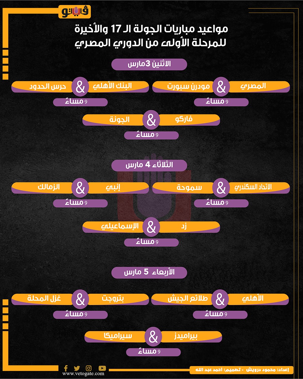 مواعيد مباريات الجولة الـ 17 والأخيرة للمرحلة الأولى من الدوري المصري (إنفوجراف)