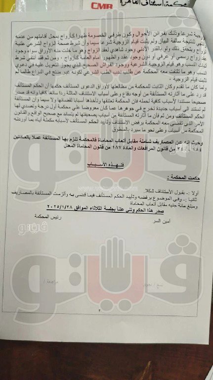 وشددت المحكمة على أن شرط صحة الزواج الشرعي هو العلنية، وهو ما يستوجب وجود شاهدين على عقد الزواج، وهو الأمر الذي لم يتوافر وفقًا للأوراق المقدمة.