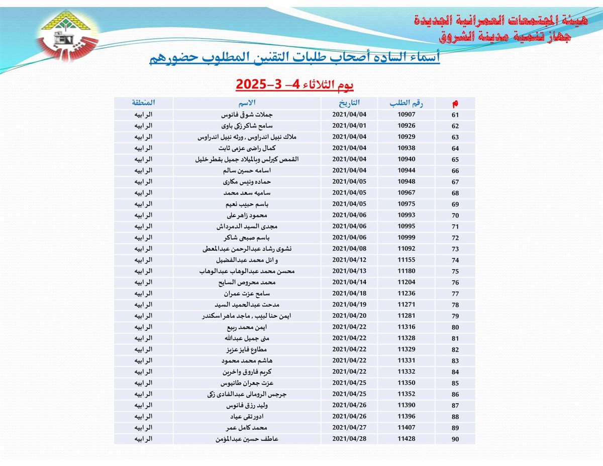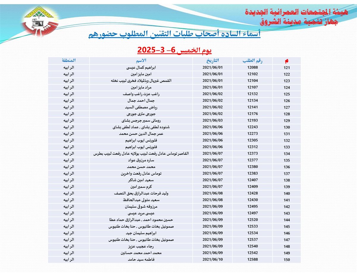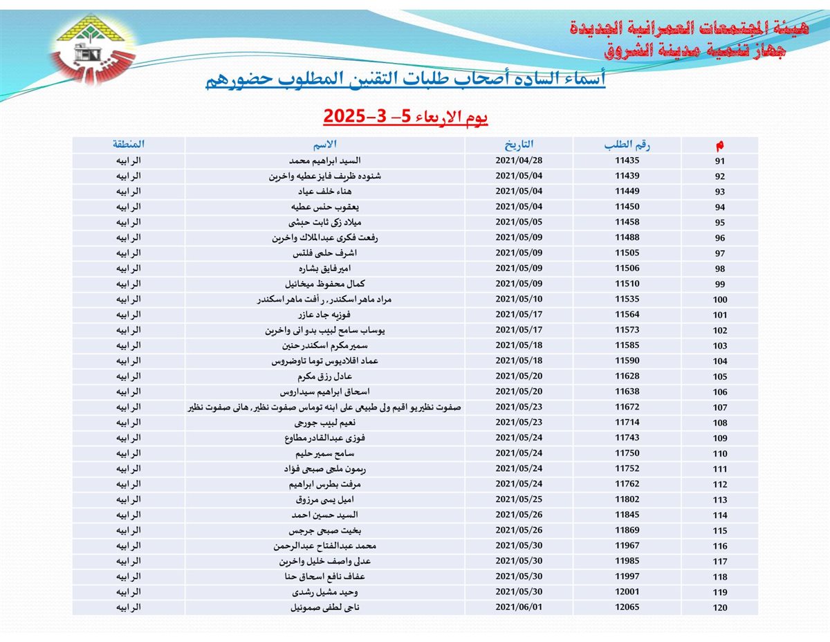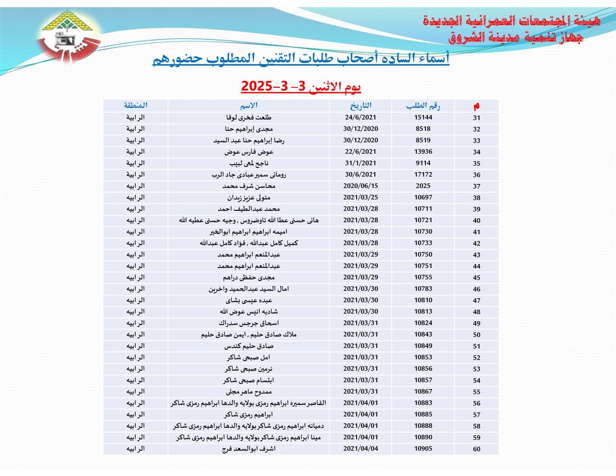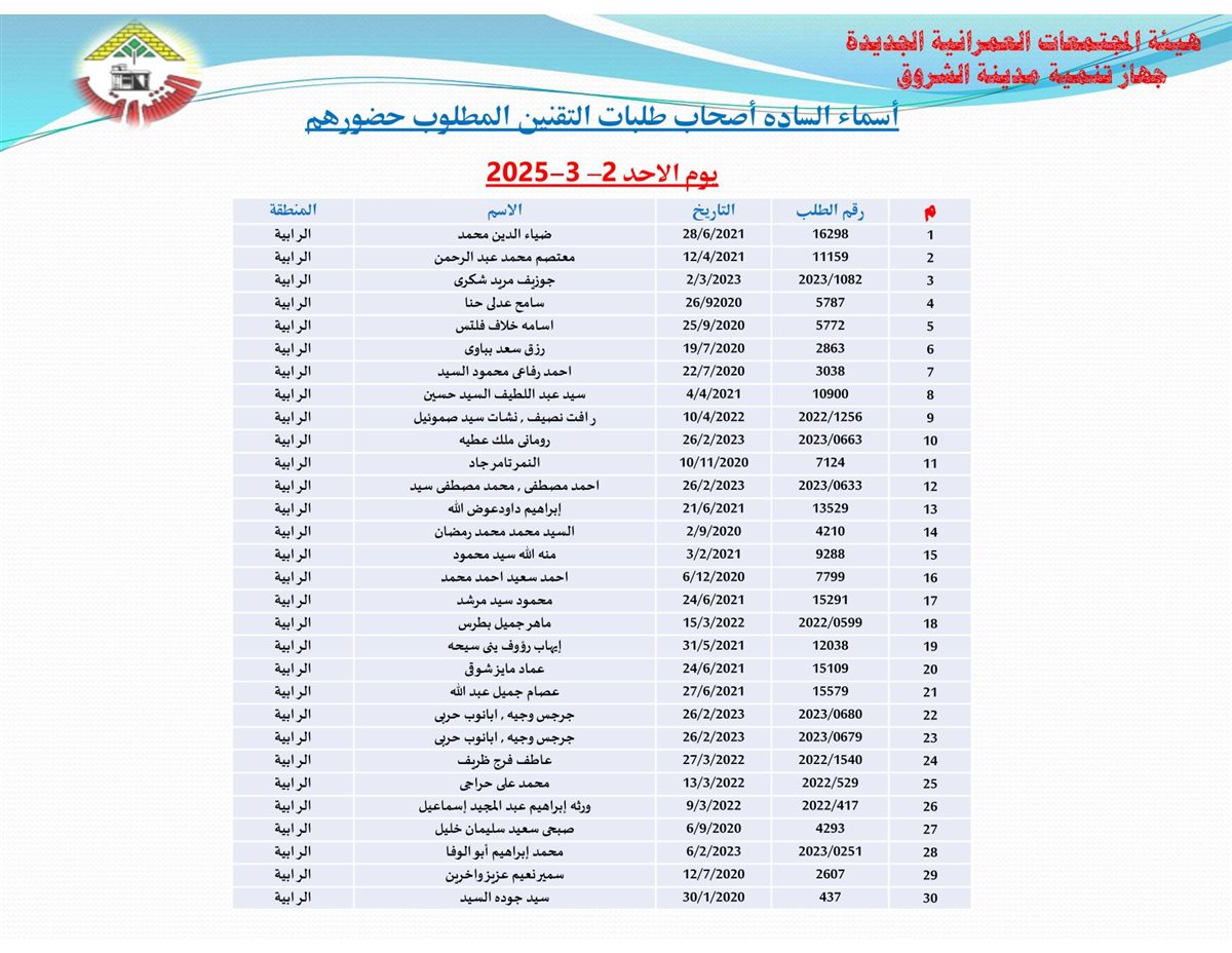 أعلنت هيئة المجتمعات العمرانية بوزارة الإسكان أسماء دفعة جديدة من المواطنين أصحاب طلبات تقنين أراضيهم بتوسعات مدينة الشروق، وذلك للحضور لمقر جهاز المدينة لاستكمال إجراءات التقنين بداية من اليوم الأحد 2 مارس استكمال إجراءات التقنين.