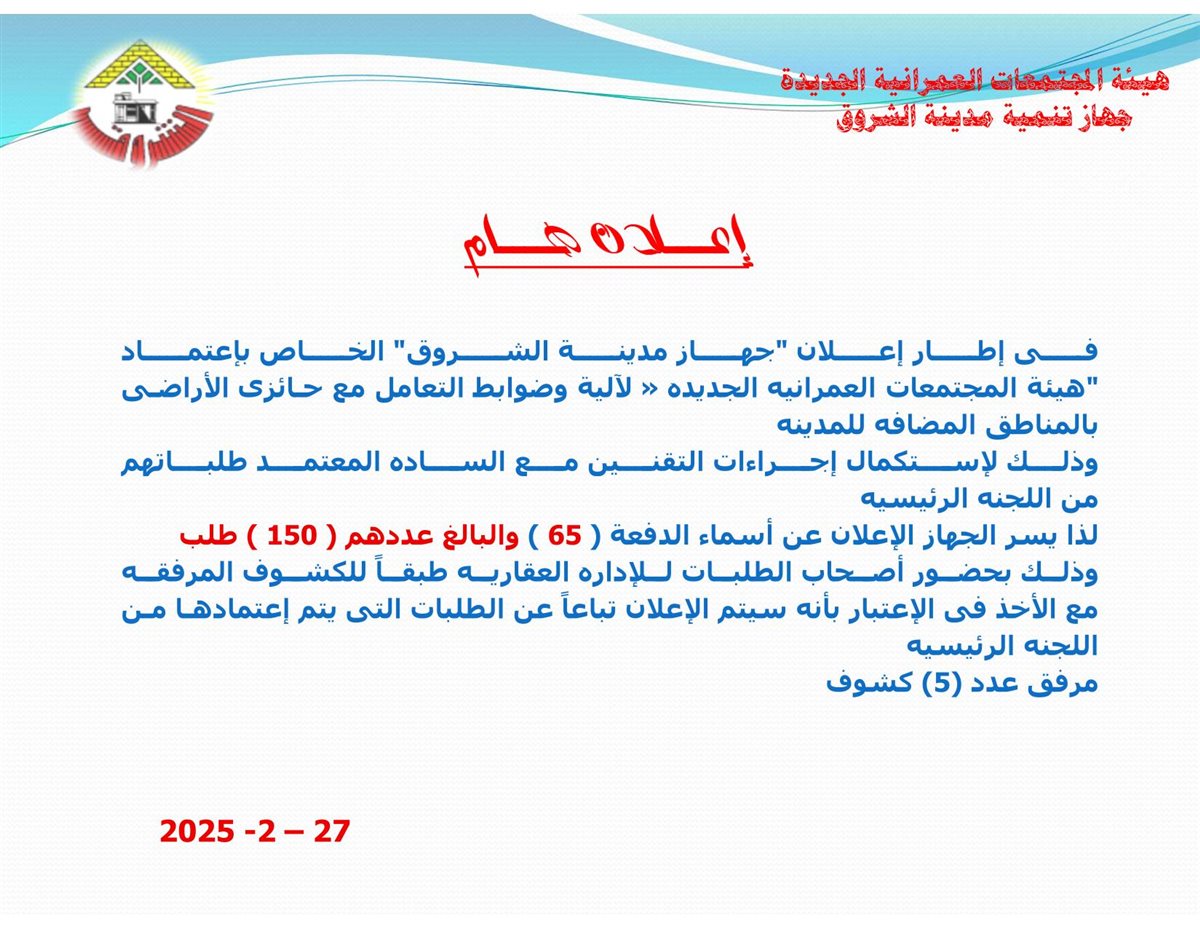 وأشار جهاز مدينة الشروق إلى أنه في إطار اهتمام الهيئة بآلية وضوابط التعامل مع حائزي الأراضي بالمناطق المضافة للمدينة يتم استقبال المواطنين أصحاب الطلبات لاستكمال إجراءات التقنين المعتمدة طلباتهم من اللجنة الرئيسية للتقنين.