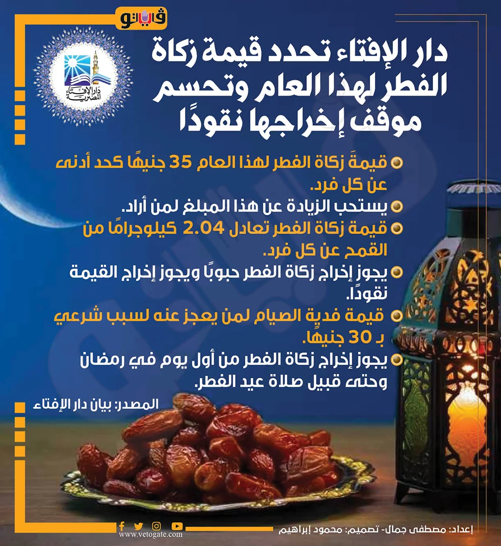 كما أوضحت دار الإفتاء أسس تحديد قيمة زكاة الفطر لهذا العام، حيث حدَّد الدكتور نظير محمد عيَّاد -مفتي الجمهورية، رئيس الأمانة العامة لدور وهيئات الإفتاء في العالم- قيمةَ زكاة الفطر لهذا العام 1446 هجريًّا بـ (35 جنيهًا) كحدٍّ أدنى عن كل فرد، كما حدَّد قيمة فدية الصيام لمن يعجز عنه لسبب شرعي معتبر بـ (30 جنيهًا) لهذا العام.