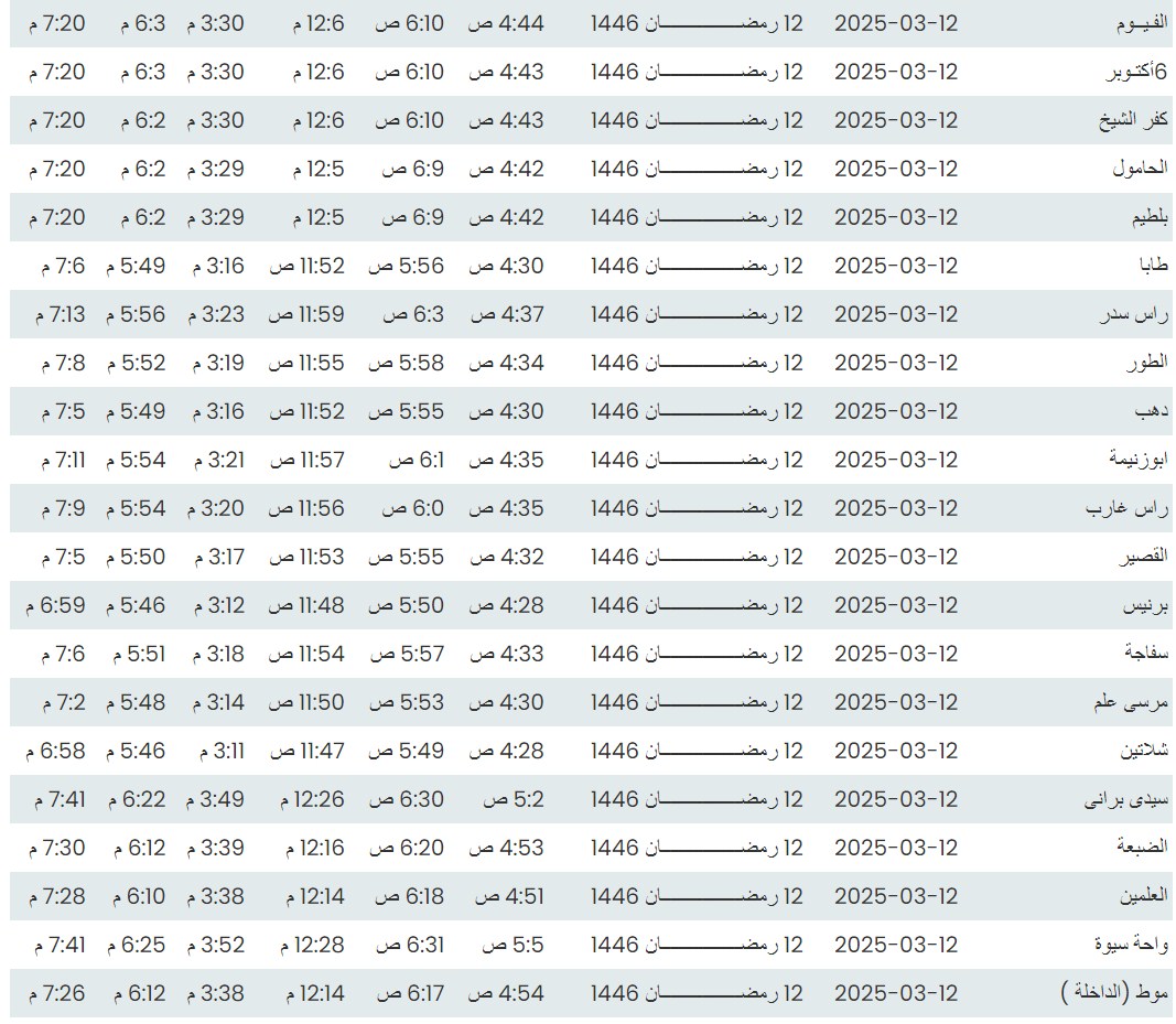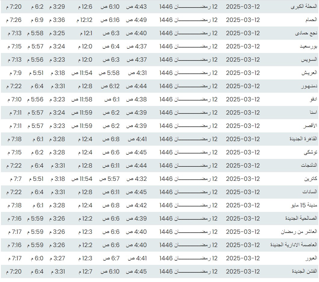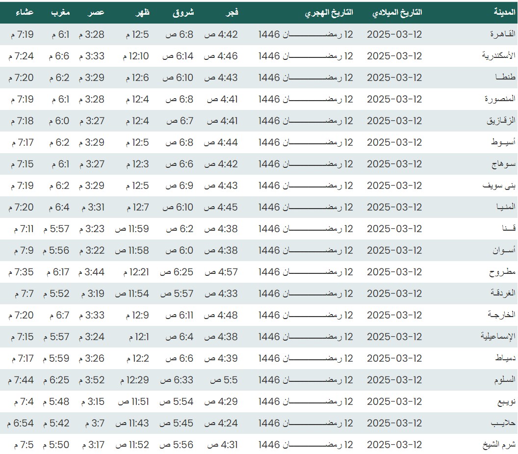 مواقيت الصلاة اليوم الأربعاء 12 - 3- 2025 في القاهرة والمحافظات