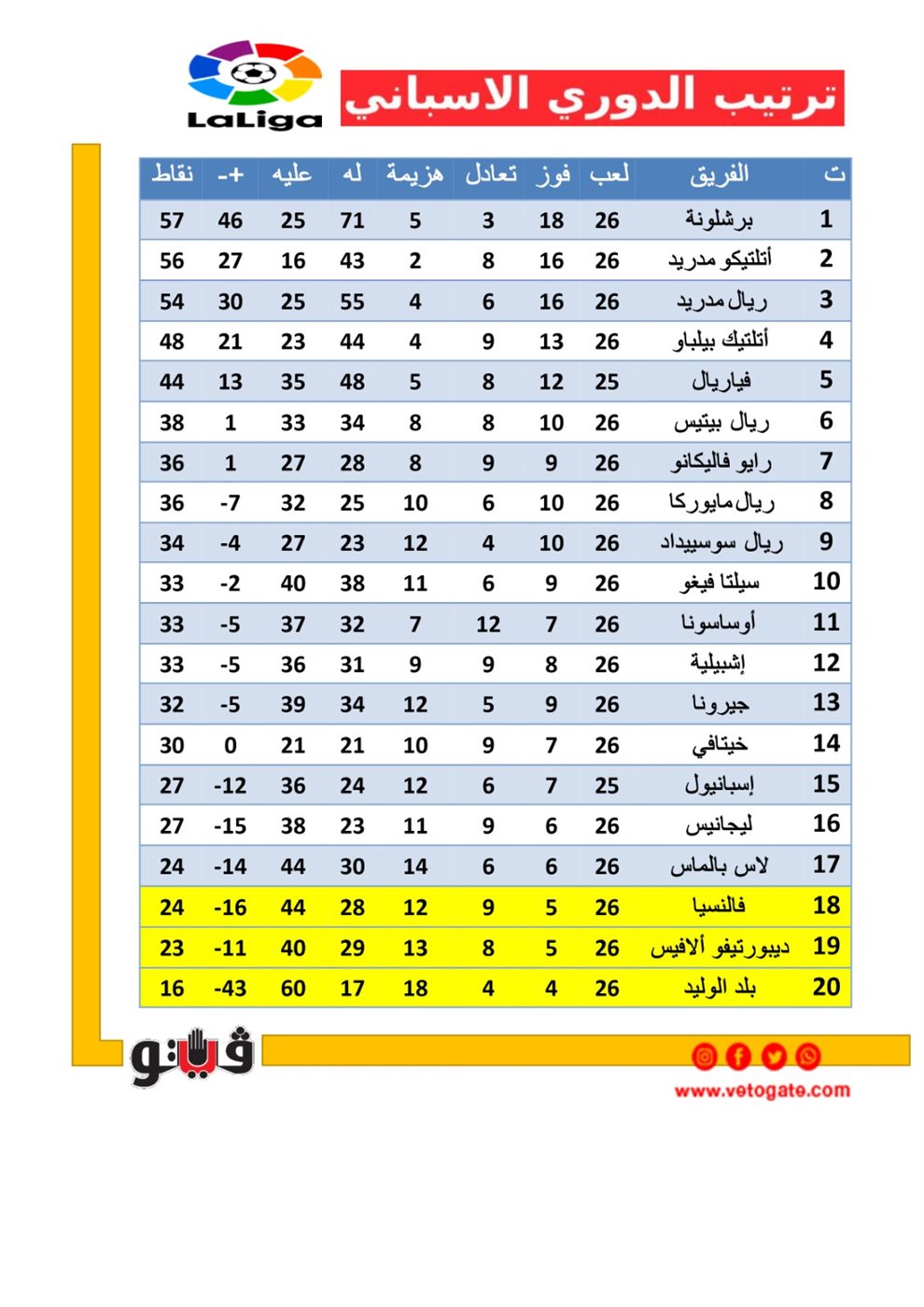 ترتيب الدوري الإسباني، تختتم اليوم الاثنين مباريات الجولة الـ 26 من الدوري الاسباني بمواجهة فياريال ضد إسبانيول.