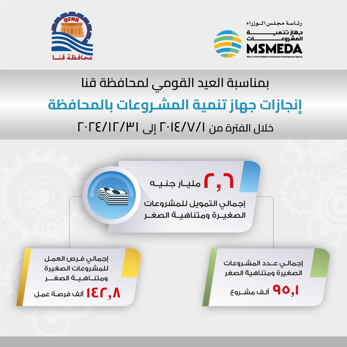 ووجه رحمي تهنئة لمحافظ قنا ولشبابها وعملاء جهاز تنمية المشروعات بالمحافظة بمناسبة الاحتفال بالعيد القومي لمحافظة قنا مؤكدا حرص الجهاز علي الاستمرار في توفير التمويلات اللازمة لإقامة المزيد من المشروعات الصغيرة أو دعمها بالخدمات غير المالية مشيرا إلى أن الجهاز قد قام بضخ تمويلات قدرها 2.6 مليار جنيه في الفترة من يوليو 2014 وحتى ديسمبر 2024 تم خلالها تمويل ما يزيد عن 95 ألف مشروع صغير ومتناهي ووفرت ما يزيد على 142 ألف فرصة عمل.