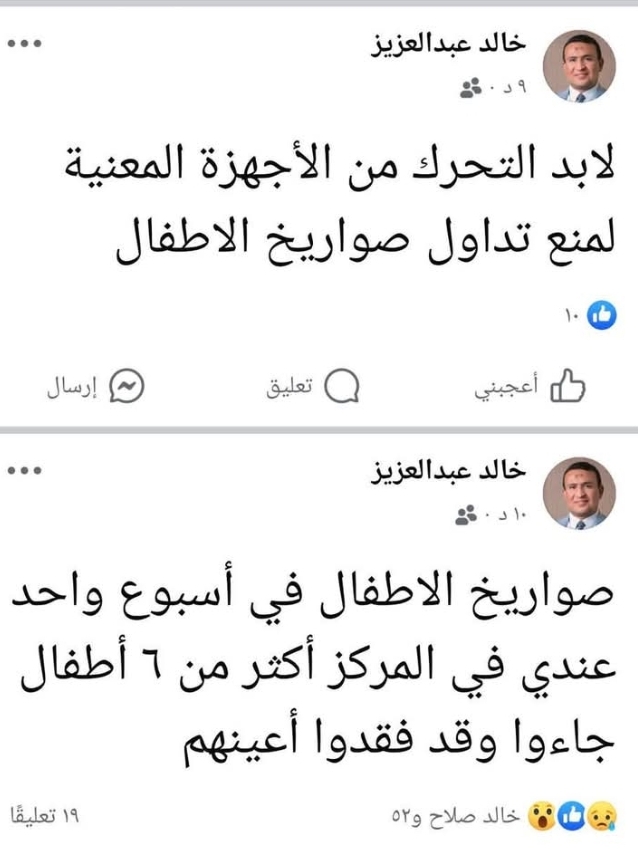 وقال الدكتور خالد في منشور له عبر صفحته الشخصية بموقع التواصل الاجتماعي فيسبوك: "خلال أسبوع واحد فقط، استقبلت في المركز الطبي أكثر من 6 أطفال فقدوا أعينهم بسبب تلك الصواريخ، الإصابات مؤلمة جدًّا، بعضها أدى إلى فقدان البصر بشكل كامل في إحدى العينين، وأخرى تطلبت عمليات دقيقة لإنقاذ ما يمكن إنقاذه".