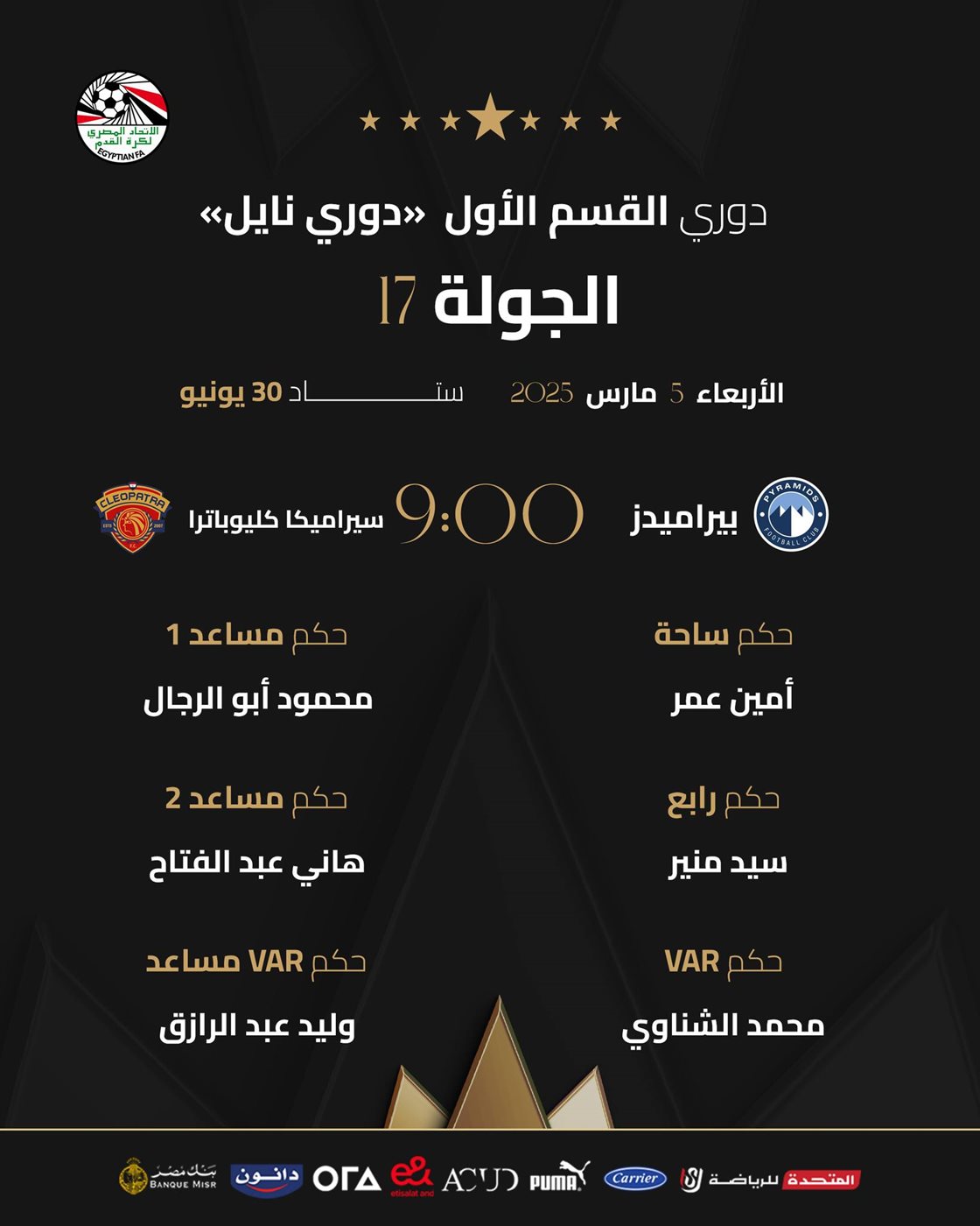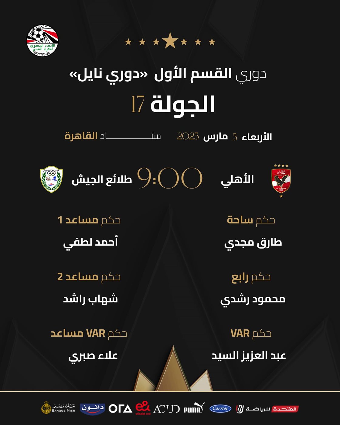 أبرزها الأهلي ضد طلائع الجيش، حكام مباريات غد الأربعاء في الدوري المصري