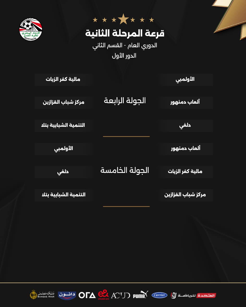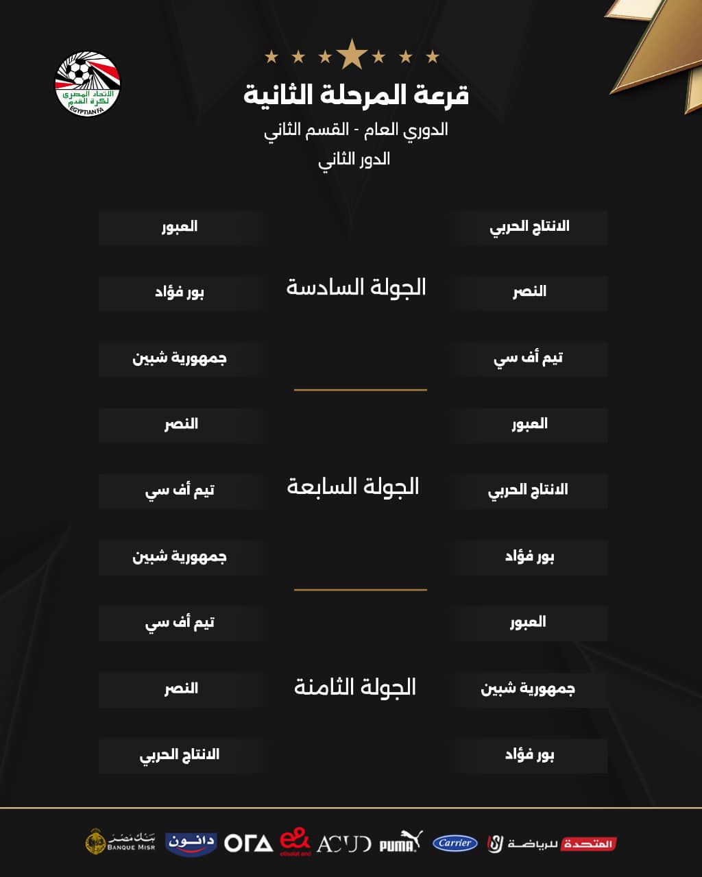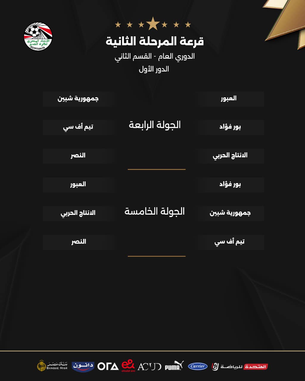 المجموعة الثالثة “ العبور، النصر، بورفؤاد”، المجموعة الرابعة “ الإنتاج الحربي، جمهورية شبين، تيم إف سي”.
