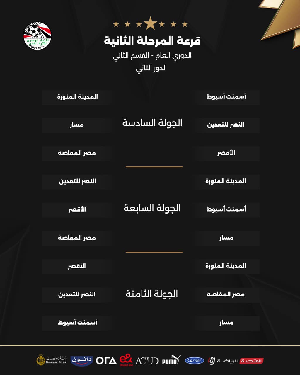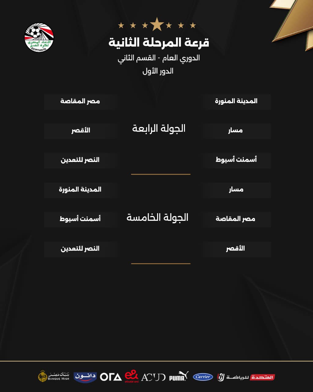 والمجموعة الأولي: "النصر للتعدين، الأقصر، المدينة"، المجموعة الثانية «مسار، أسمنت أسيوط، مصر المقاصة".