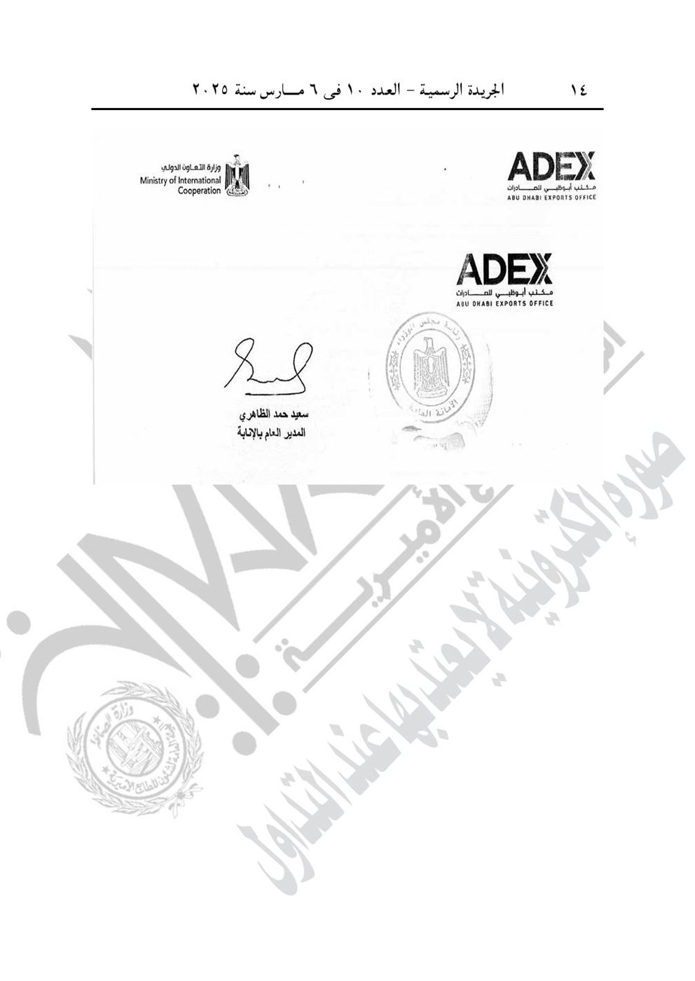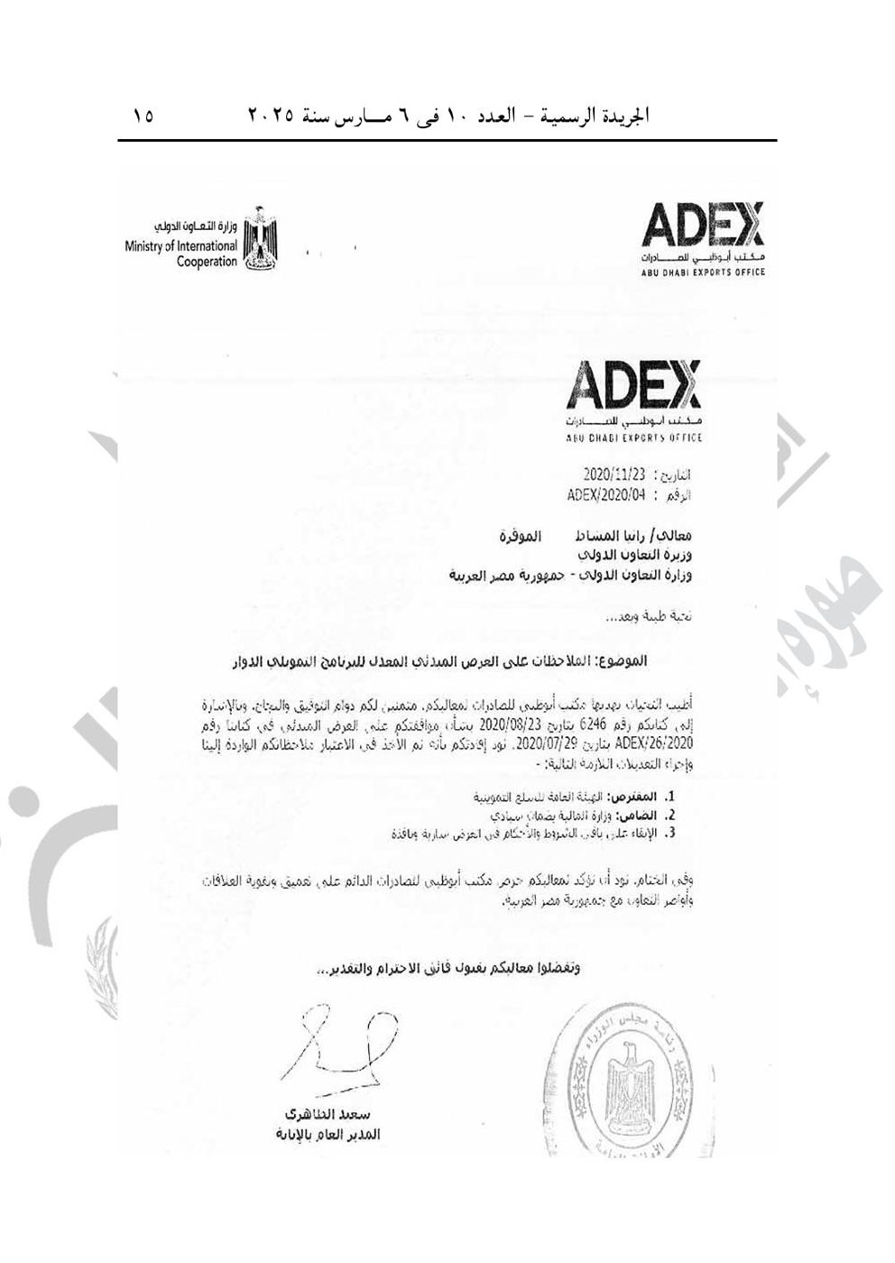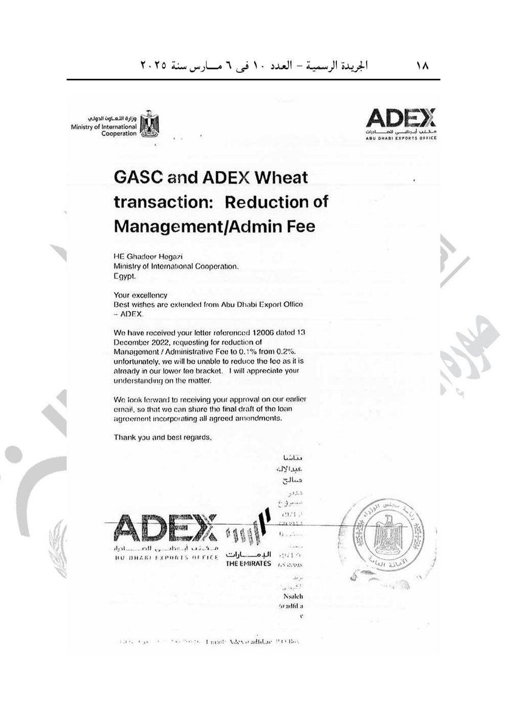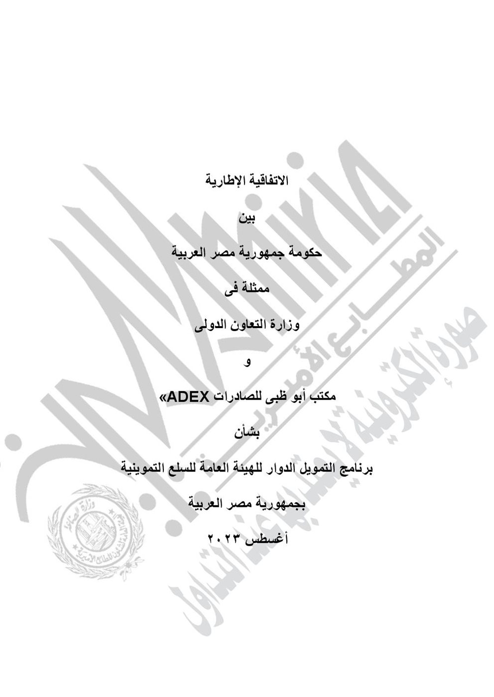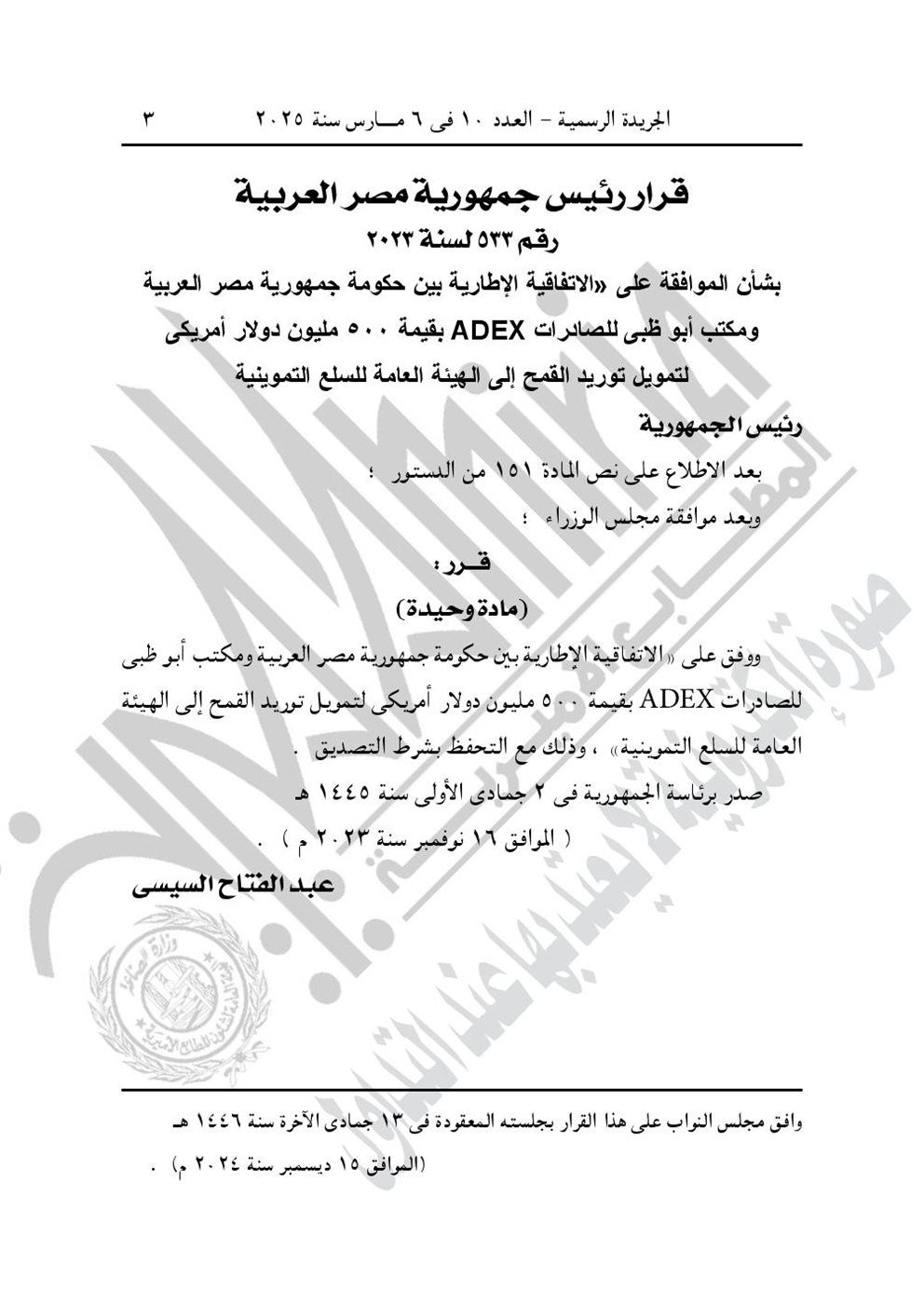 القرار حمل رقم 533 لسنة 2023، بشأن الموافقة على الاتفاقية الإطارية بين حكومة جمهورية مصر العربية ومكتب أبو ظبى للصادرات ADEX بقيمة 500 مليون دولار أمريكى، لتمويل توريد القمح إلى الهيئة العامة للسلع التموينية.
