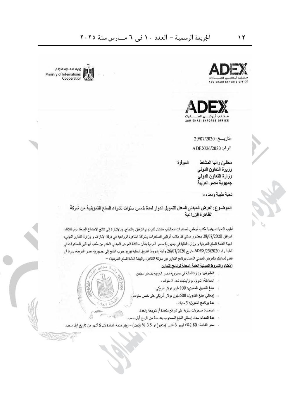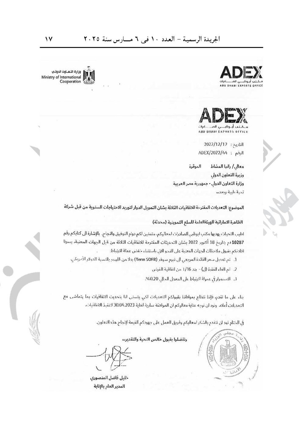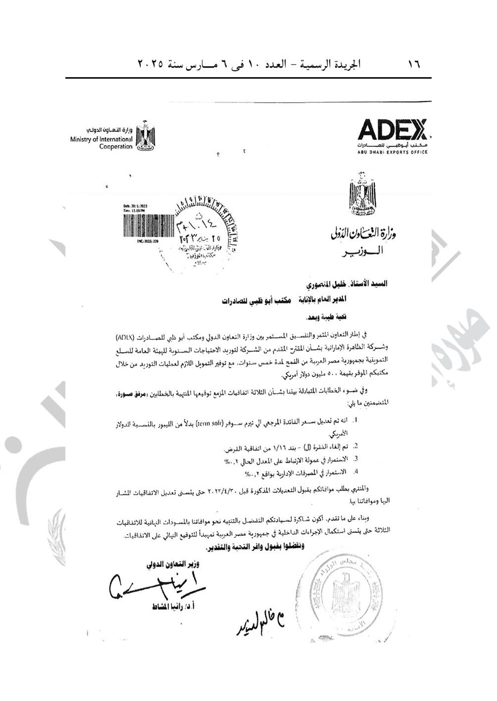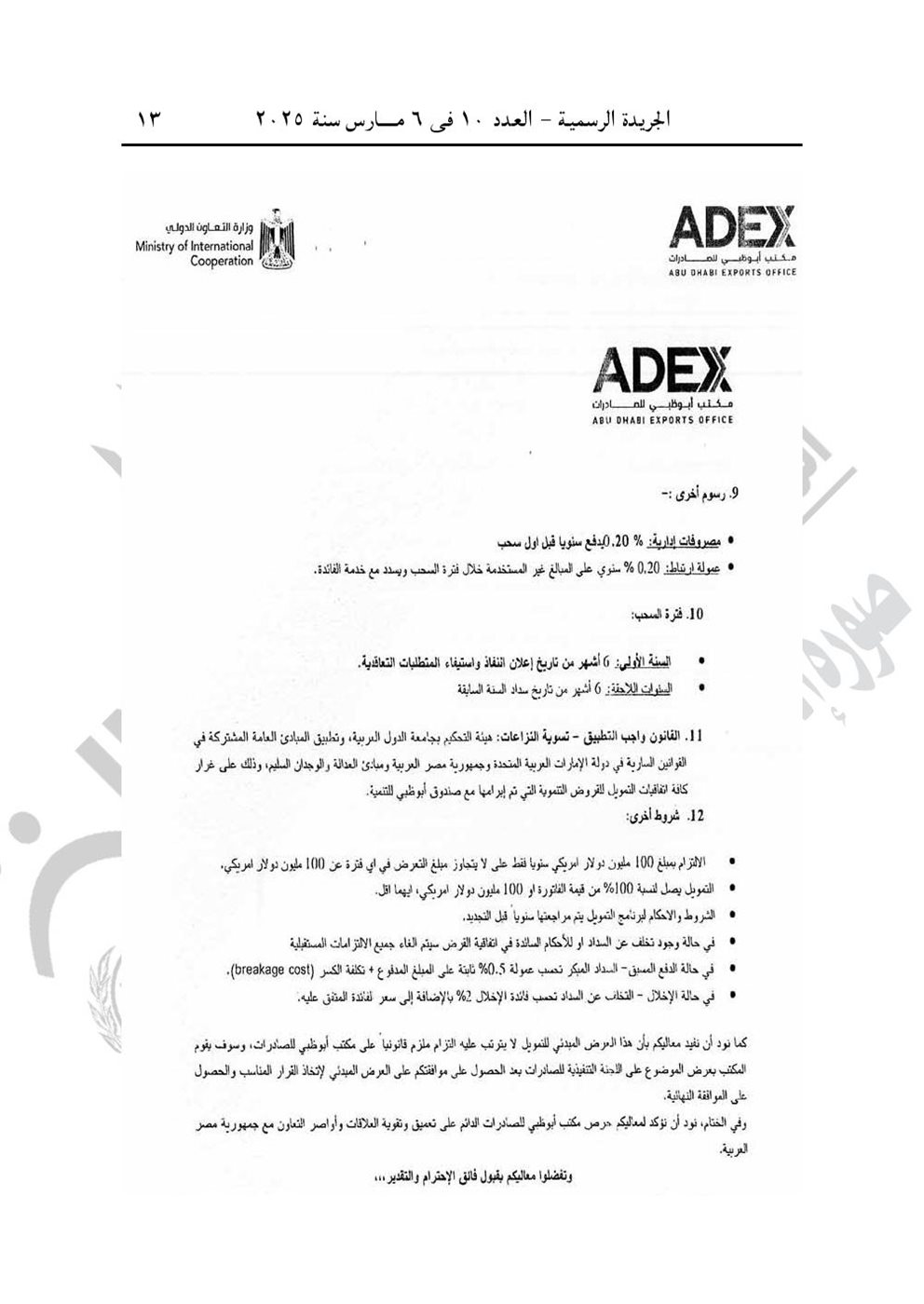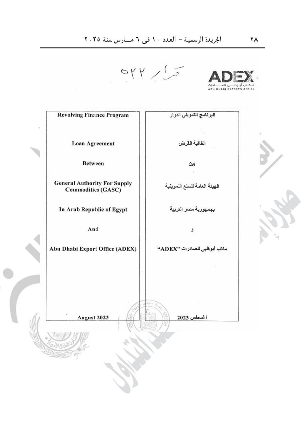 ونص القرار الجمهوري الجديد اليوم في مادته الأولى على "الموافقة على على الاتفاقية الإطارية بين حكومة جمهورية مصر العربية ومكتب أبو ظبى للصادرات ADEX بقيمة 500 مليون دولار أمريكى، لتمويل توريد القمح إلى الهيئة العامة للسلع التموينية، وذلك مع التحفظ بشرط التصديق.