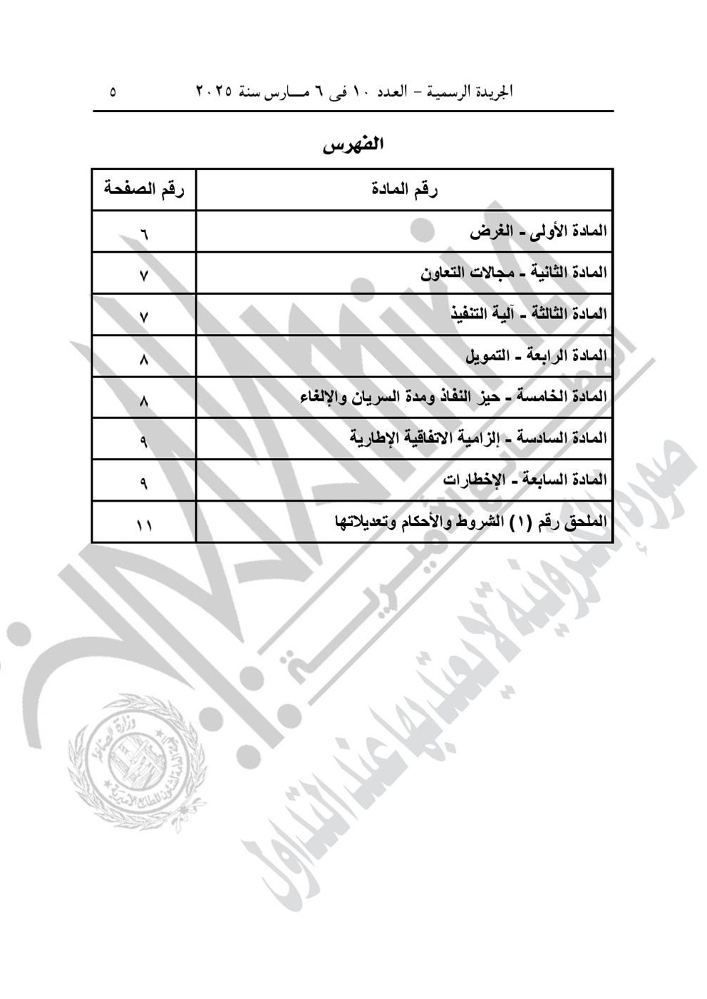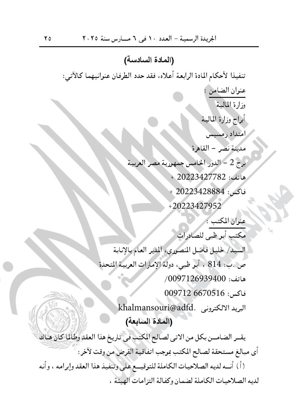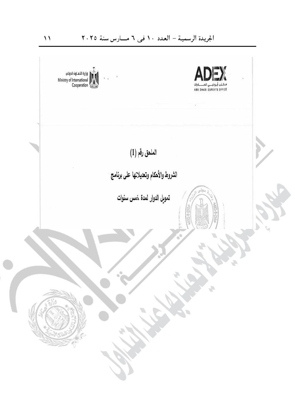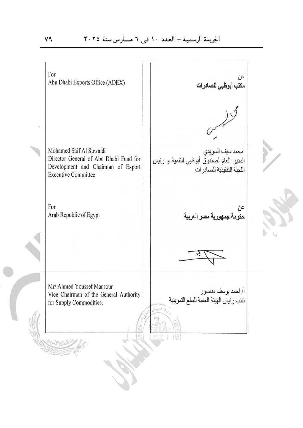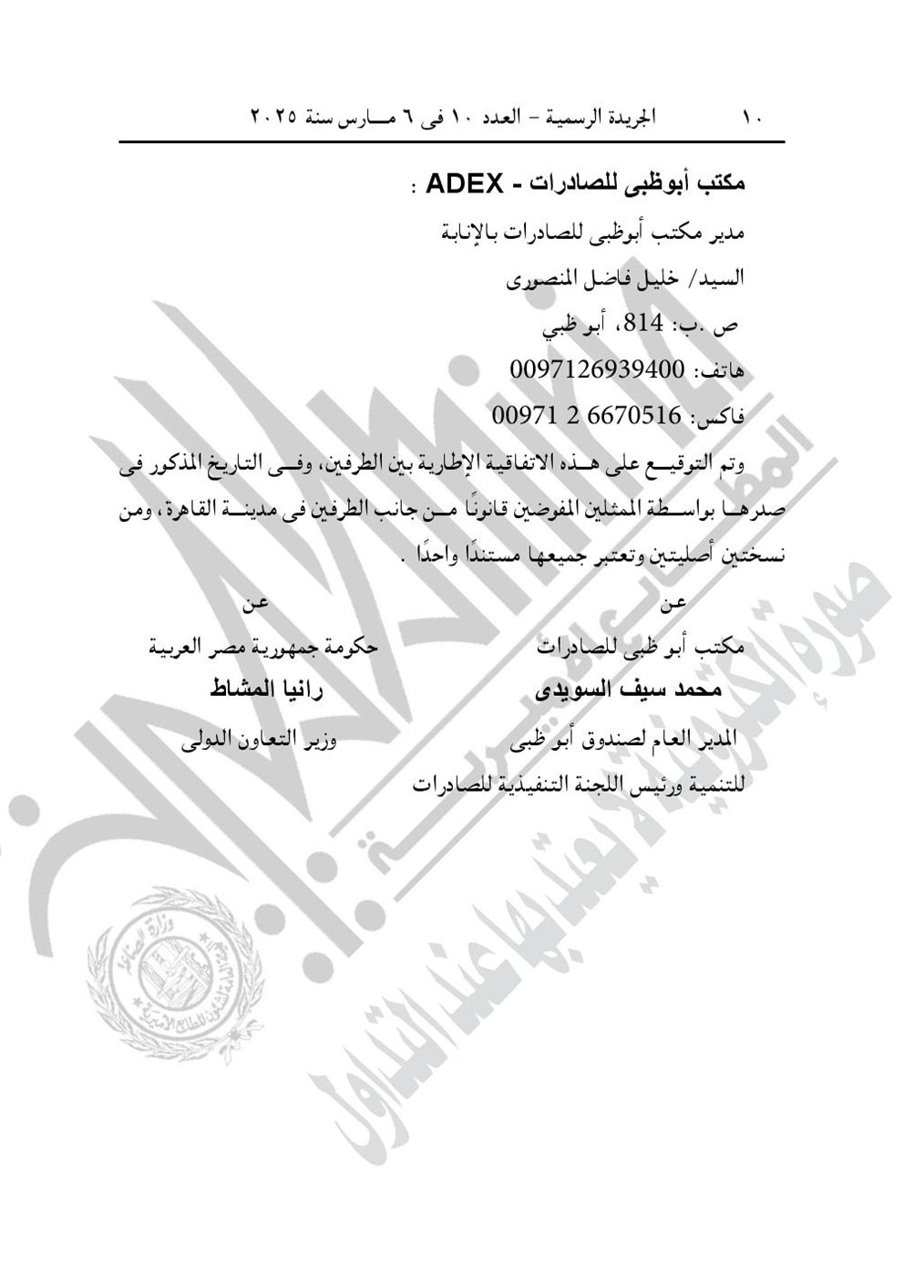 ونص القرار الجمهوري الجديد اليوم في مادته الأولى على "الموافقة على على الاتفاقية الإطارية بين حكومة جمهورية مصر العربية ومكتب أبو ظبى للصادرات ADEX بقيمة 500 مليون دولار أمريكى، لتمويل توريد القمح إلى الهيئة العامة للسلع التموينية، وذلك مع التحفظ بشرط التصديق.