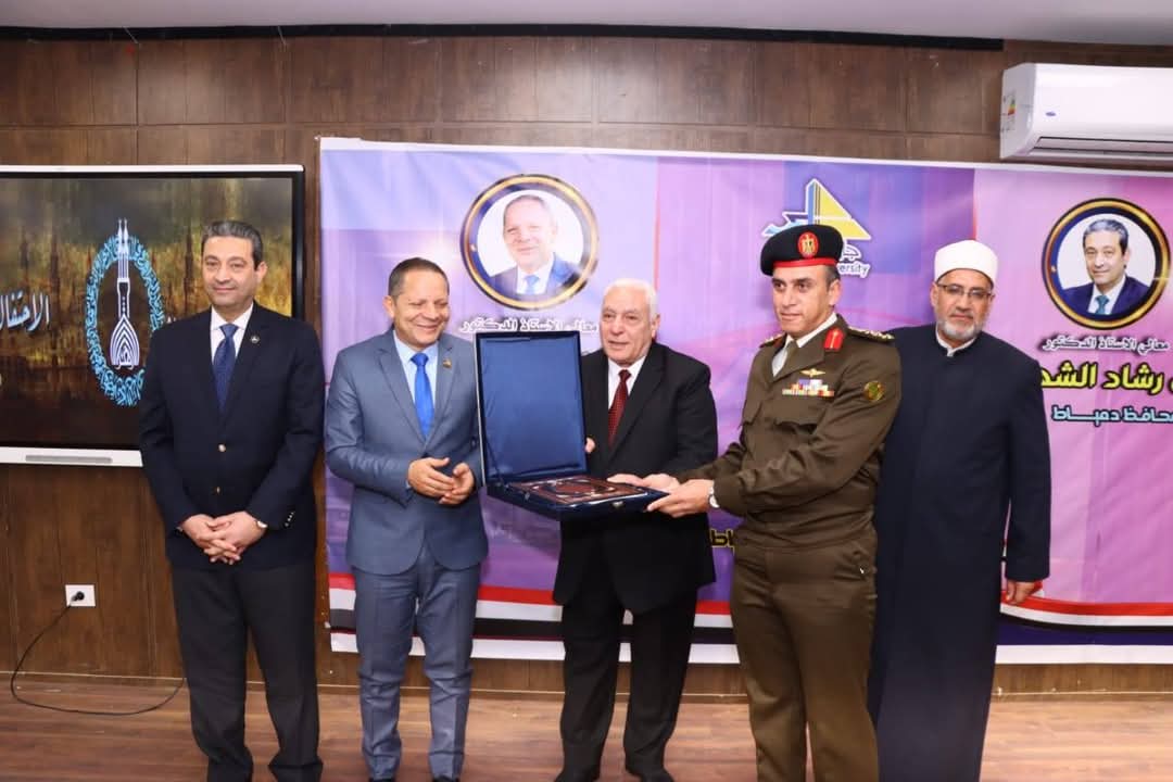 كما تم خلاله، تكريم محافظ دمياط ورئيس جامعة دمياط والأستاذ الدكتور أسامة العبد والمستشار العسكرى