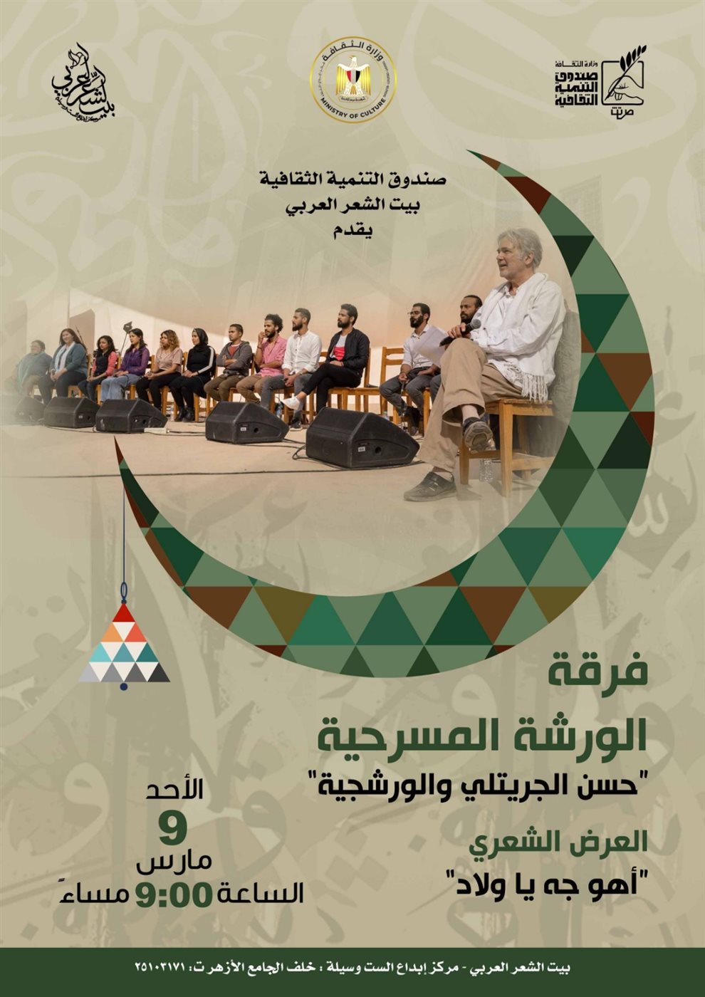 كما يستضيف بيت الشعر العربي بمنزل الست وسيلة -خلف الجامع الأزهر- الأمسية الفنية "أهو جه ياولاد" لفرقة الورشة المسرحية مع المخرج "حسن الجريتلي" والورشجية والمدرب بهاء طلبه.