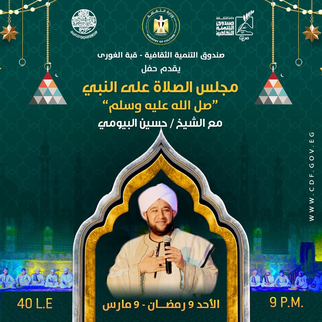 في إطار البرنامج الثقافي والفني الذي يقدمه قطاع صندوق التنمية الثقافية برئاسة المعماري حمدي السطوحي بمراكز الإبداع المتنوعة خلال شهر رمضان، يشهد مركز إبداع قبة الغوري بشارع الأزهر، في التاسعة مساء غدًا الأحد (9 رمضان) أمسية دينية يُحيِيها "مجلس الصلاة على النبي" مع الشيخ حسين البيومي رئيس رابطة مجالس الصلاة على النبي صل الله عليه وسلم بمصر والعالم الإسلامي.