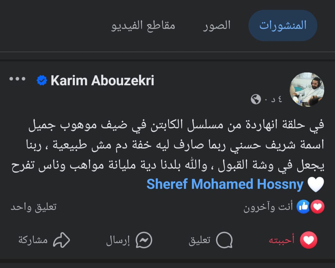 وأعلن أبو ذكري عن ذلك عبر منشور على حسابه بموقع فيسبوك، قائلًا: "في حلقة النهاردة من مسلسل الكابتن، في ضيف موهوب جميل اسمه شريف حسني، ربنا صارف ليه خفة دم مش طبيعية، ربنا يجعل في وشه القبول، والله بلدنا دي مليانة مواهب وناس تفرح."