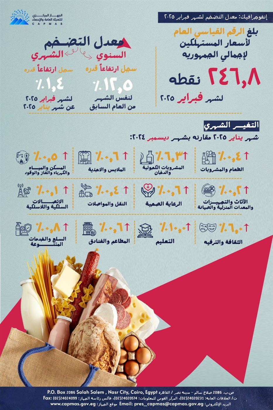 التضخم في فبراير، كشف التقرير الشهري الصادر عن الجهاز المركزي للتعبئة العامة والإحصاء، أن الرقم القياسي العام لأسعار المستهلكين لإجمالي الجمهورية بلغ (246.8) نقطة لشهر فبراير 2025، مسجلًا بذلك تضخمًا سنويًا قدره (12.5%) مـقابـــل ( 23.2%) لشهر يناير 2025.