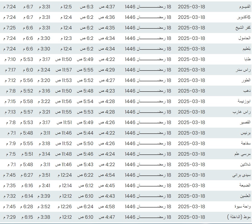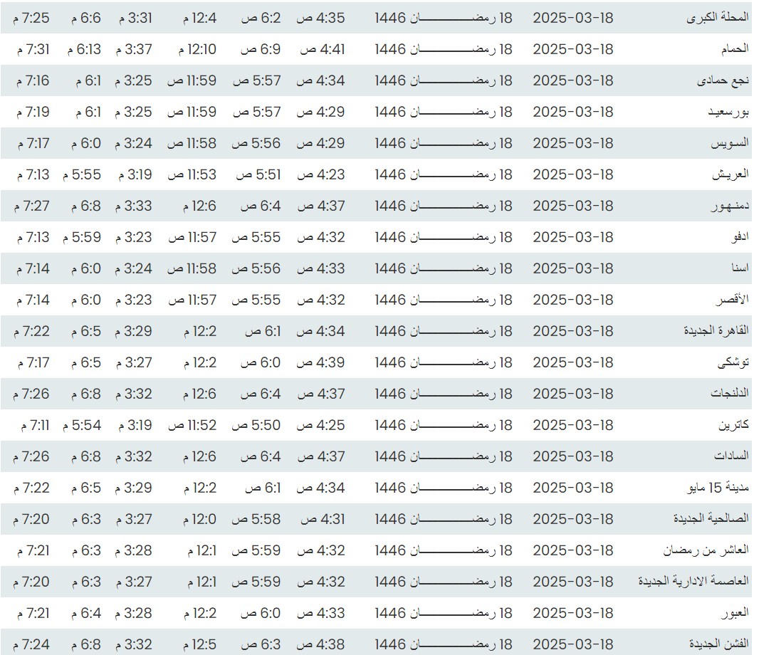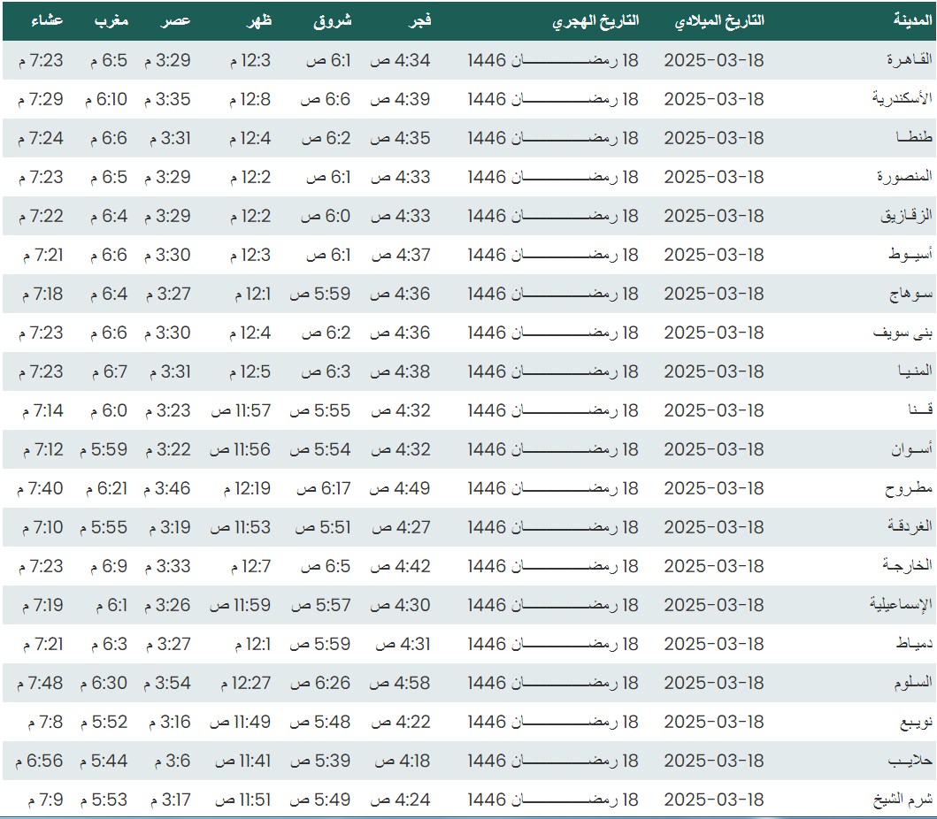 وفيما يلي مواقيت الصلاة، لعدد من مدن ومحافظات الجمهورية من واقع بيانات الهيئة العامة للمساحة