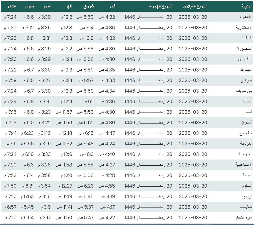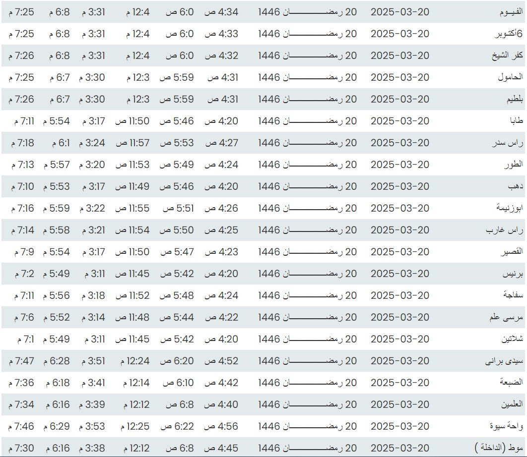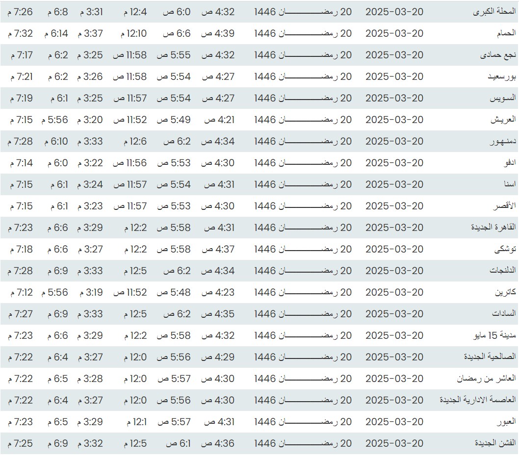 وفيما يلي مواقيت الصلاة، لعدد من مدن ومحافظات الجمهورية من واقع بيانات الهيئة العامة للمساحة