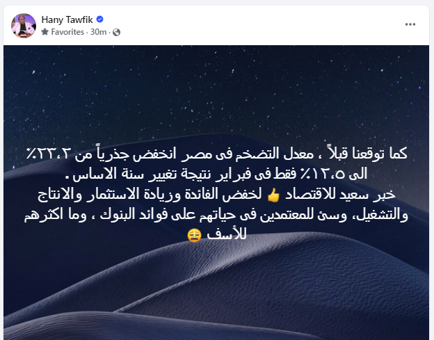وقال الخبير الاقتصادي هاني توفيق عن انخفاض معدل التضخم في مصر: "كما توقعنا قبلًا، معدل التضخم فى مصر انخفض جذريًا من 23.2٪ الى 12.5% فقط فى فبراير نتيجة تغيير سنة الأساس."