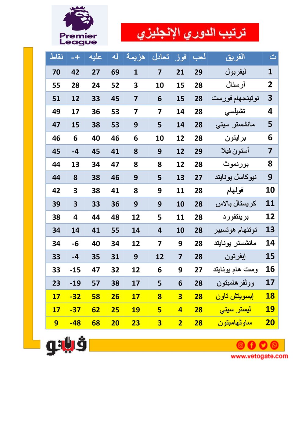 1- ليفربول 70 نقطة