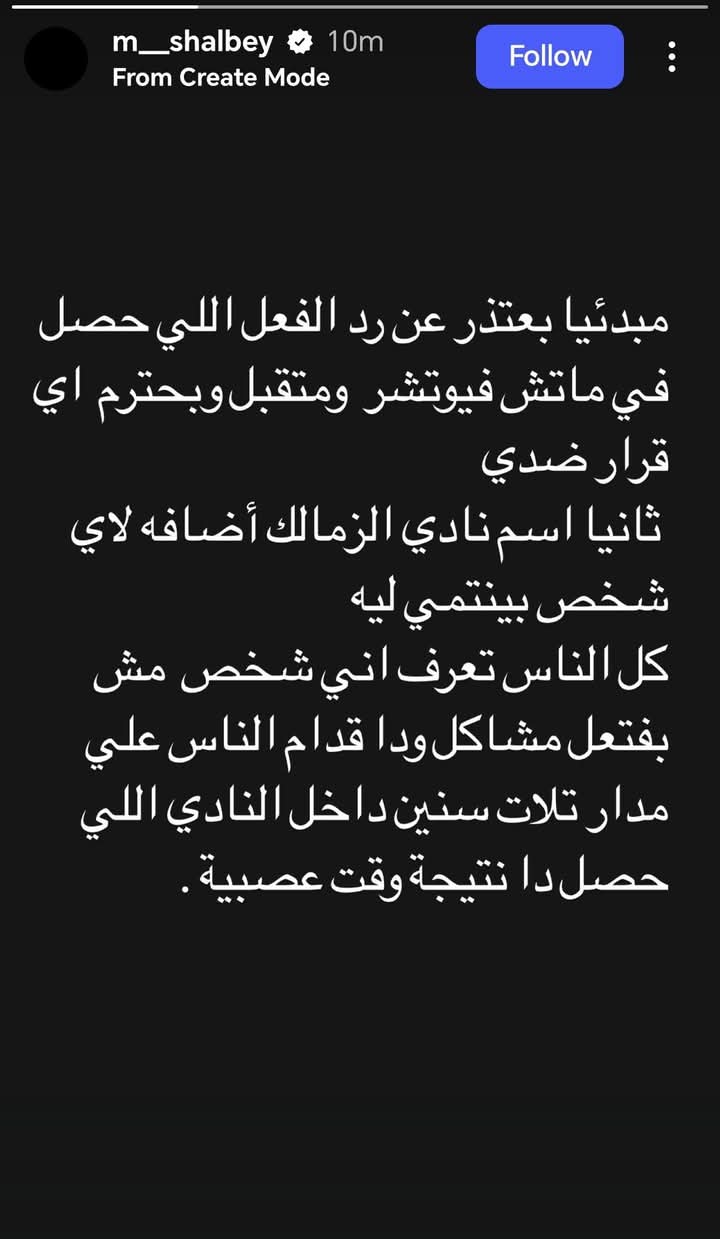 وحرص مصطفى شلبي عبر حسابه على انستجرام على توجيه رسالة اعتذار لجماهير الزمالك وكتب التالي: