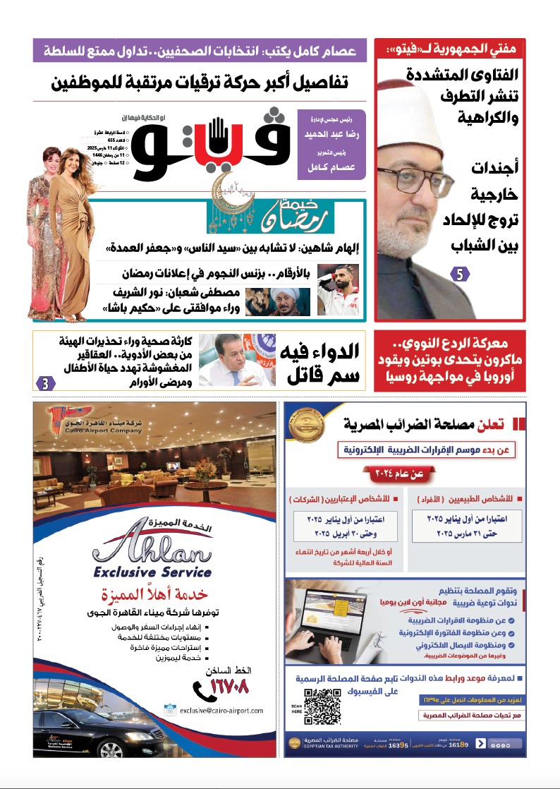 فيتو تكشف في عددها الجديد: كارثة صحية وراء تحذيرات هيئة الدواء.. وتفاصيل أكبر حركة ترقيات للموظفين