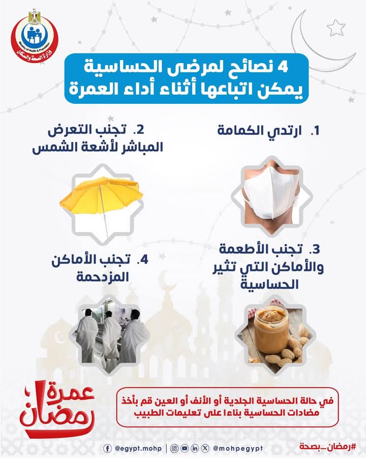 وجهت وزارة الصحة نصائح لمرضى الحساسية المسافرين لأداء مناسك العمرة والتي يجب اتباعها أثناء أداء العمرة منها: