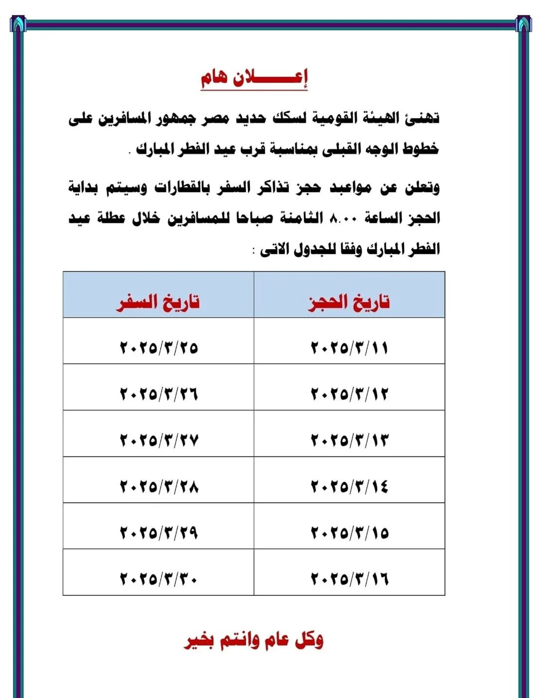 وحددت هيئة السكك الحديدية مواعيد بدء حجز القطارات بمناسبة عيد الفطر المبارك، خلال عطلة عيد الفطر المبارك على خطوط الوجه القبلي اعتبارًا من الثلاثاء 11 مارس من الساعة 8 الثامنة صباحًا وذلك على النحو التالي: