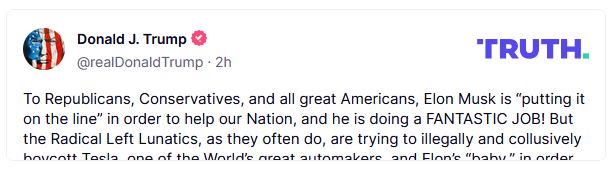 وكتب ترامب في منشور على منصته "تروث سوشيال": "ماسك يخاطر بكل شيء من أجل مساعدة أمتنا، وهو يقوم بعمل رائع!"، متهما "المتطرفين اليساريين المجانين" بمحاولة "مقاطعة تسلا بشكل غير قانوني وتواطئي، وهي واحدة من أعظم شركات صناعة السيارات في العالم".