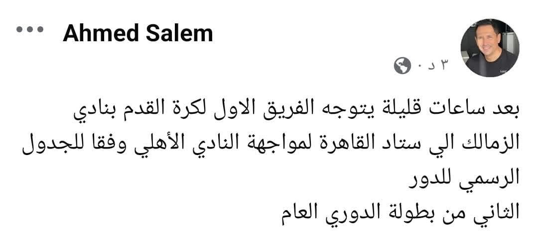 أعلن أحمد سالم المتحدث الرسمي لنادي الزمالك، أن الفريق الأبيض سيتوجه بعد ساعات قليلة إلى استاد القاهرة لمواجهة الأهلي في التاسعة والنصف مساء اليوم.