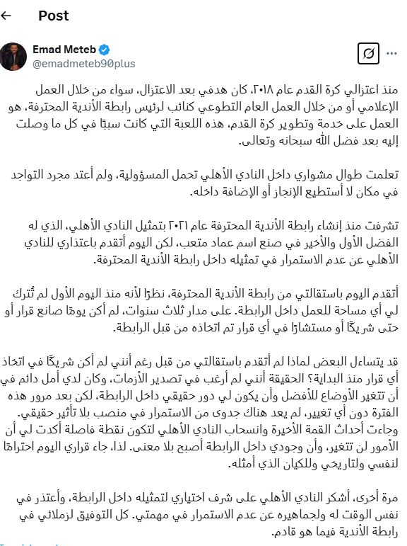 تقدم عماد متعب، نجم الأهلي ومنتخب مصر الأسبق، باستقالته من منصب نائب رئيس رابطة الأندية المحترفة خلال بيان رسمي عبر صفحته الشخصية بموقع التواصل الاجتماعي إكس.