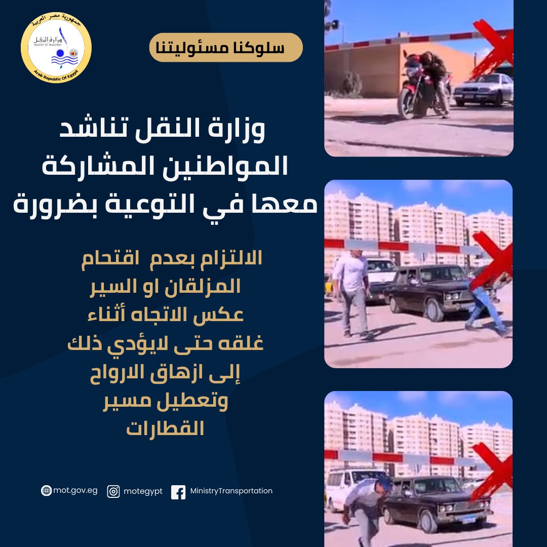 ناشدت وزارة النقل المواطنين بضرورة توخي الحذر عند عبور مزلقانات السكك الحديدية والالتزام بتعليمات هيئة السكك الحديدية عند العبور والعبور بعد فتح المزلقان ومرور القطار وعدم اقتحام المزلقان او السير عكس الاتجاه أثناء غلقه.
