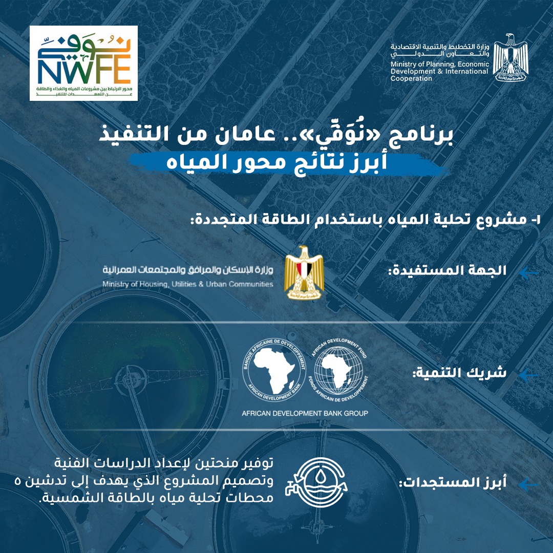 وسرد التقرير مخرجات مرحلة التأهيل الفني لمشروعات محور "المياه"، فيما يتعلق بمشروع (تحلية المياه باستخدام الطاقة المتجددة) والذي يشمل 5 محطات تحلية بمحافظات بورسعيد والإسكندرية ومطروح والبحر الأحمر (محطتين)، وتنفذه وزارة الإسكان والمرافق والمجتمعات العمرانية، بالشراكة مع البنك الأفريقي للتنمية.