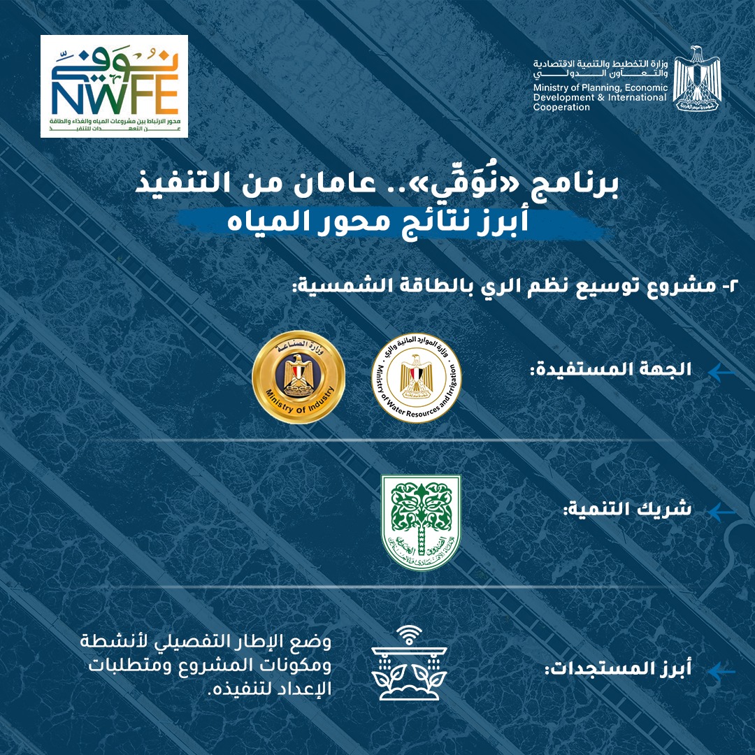 كشف تقرير المتابعة الثاني حول المنصة الوطنية لبرنامج «نوفي»، مستجدات تنفيذ مشروعات محور المياه، الذي يضم مشروعين هما؛ مشروع توسيع نظم الري بالطاقة الشمسية، ومشروع تحلية المياه باستخدام الطاقة المتجددة.