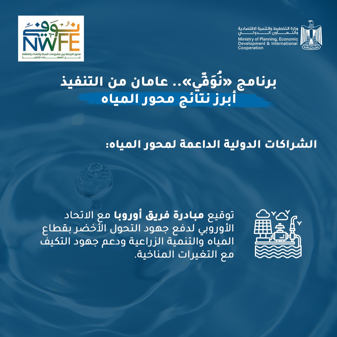 وحول الشراكات الدولية للتكامل مع جهود المنصة الوطنية لبرنامج «نُوَفِّي» في إطار محور المياه، أوضح التقرير، أن وزارة التخطيط والتنمية الاقتصادية والتعاون الدولي كانت أطلقت خلال فعاليات أسبوع القاهرة للمياه الذي عُقد تحت رعاية السيد الرئيس عبد الفتاح السيسي، رئيس الجمهورية، بعنوان: «المياه والمناخ: بناء مجتمعات مرنة»، في أكتوبر 2024، بالتعاون مع الاتحاد الأوروبي، «مبادرة فريق أوروبا»، التي تعد خطوة جديدة لدعم الجهود المُشتركة بين مصر والاتحاد الأوروبي، لدفع التحول الأخضر في قطاعات المياه، والتنمية الزراعية والريفية، حيث تستهدف المبادرة تحسين الأحوال البيئية وتعزيز التنمية الريفية من خلال معالجة التحديات الرئيسية التي تواجه قطاع الزراعة، وكذلك المياه، ودعم جهود التكيف مع التغيرات المناخية.