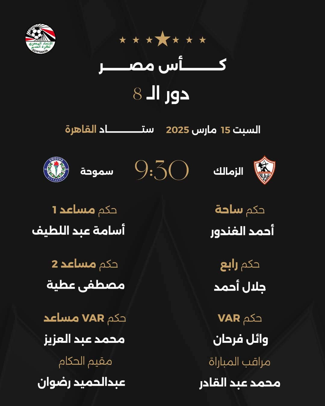 طاقم حكام مباراة الزمالك وسموحة في كأس مصر