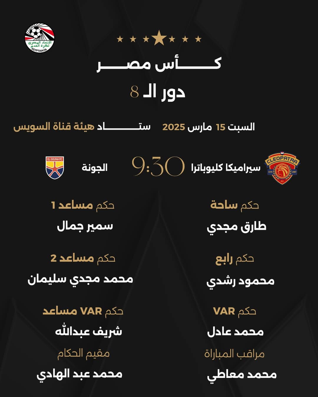 ويدير الحكم طارق مجدي لقاء سيراميكا كليوباترا والجونة، الذي يُقام على إستاد هيئة قناة السويس، ويعاونه سمير جمال ومحمد مجدي سليمان، بينما سيكون الحكم الرابع محمود رشدي.