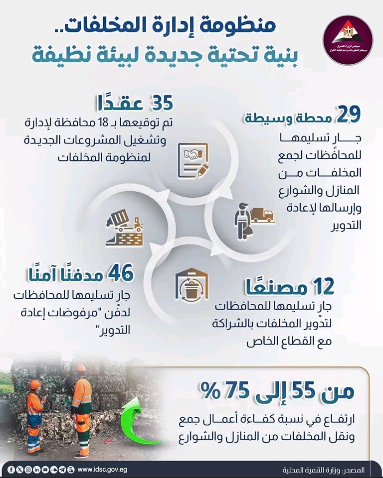 نشرت الصفحة الرسمية لمركز المعلومات ودعم اتخاذ القرار بمجلس الوزراء عبر فيسبوك إنفوجرافًا يستعرض جهود الدولة في تطوير منظومة إدارة المخلفات، من خلال تنفيذ بنية تحتية متكاملة تهدف إلى تحسين كفاءة جمع ونقل المخلفات من المنازل والشوارع، مما أدى إلى ارتفاع نسبة الكفاءة من 55% إلى 75%.