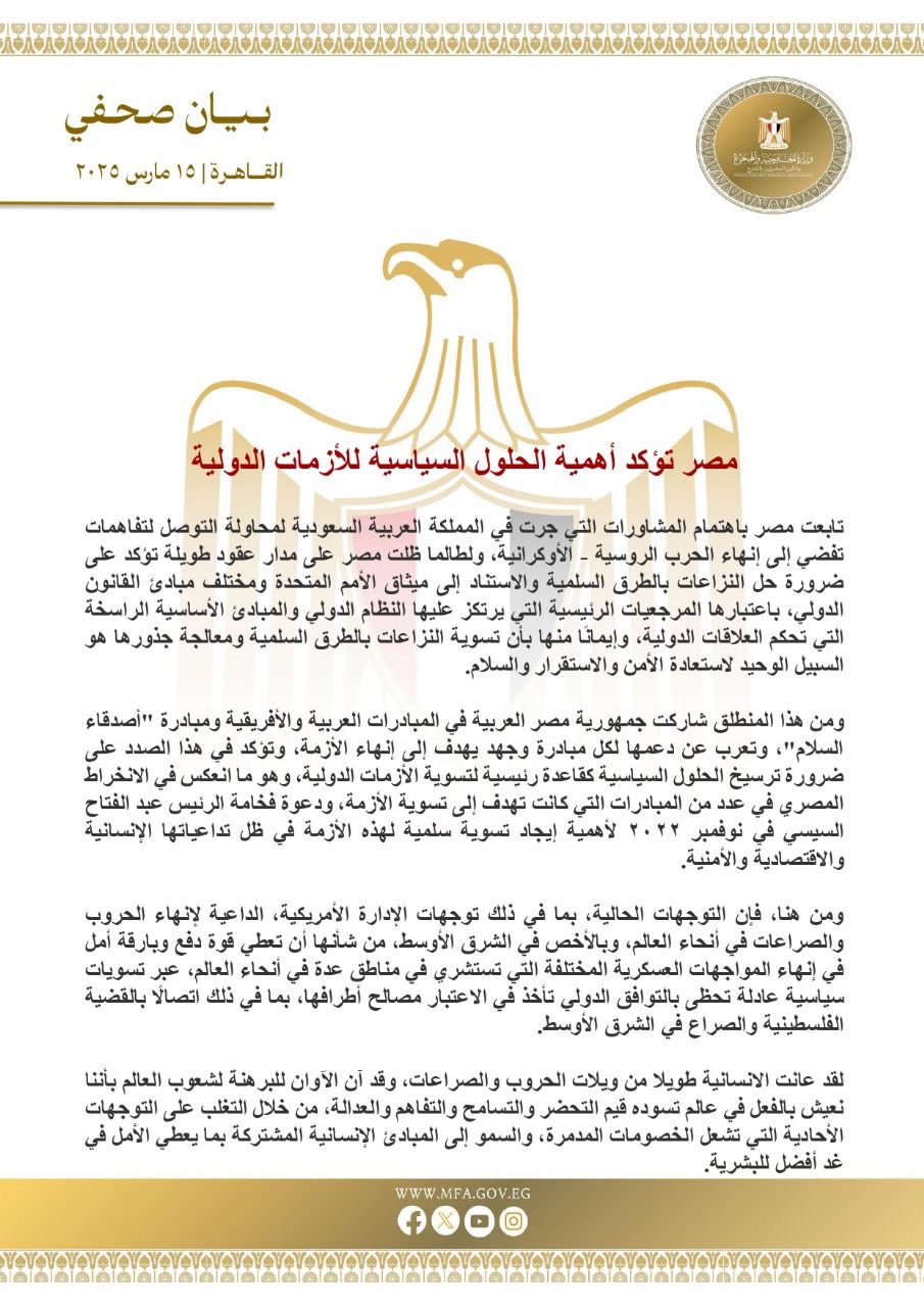 تابعت مصر باهتمام المشاورات التي جرت في المملكة العربية السعودية لمحاولة التوصل لتفاهمات تفضي إلى إنهاء الحرب الروسية - الأوكرانية، ولطالما ظلت مصر على مدار عقود طويلة تؤكد على ضرورة حل النزاعات بالطرق السلمية والاستناد إلى ميثاق الأمم المتحدة ومختلف مبادئ القانون الدولي، باعتبارها المرجعيات الرئيسية التي يرتكز عليها النظام الدولي والمبادئ الأساسية الراسخة التي تحكم العلاقات الدولية، وإيمانًا منها بأن تسوية النزاعات بالطرق السلمية ومعالجة جذورها هو السبيل الوحيد لاستعادة الأمن والاستقرار والسلام.
