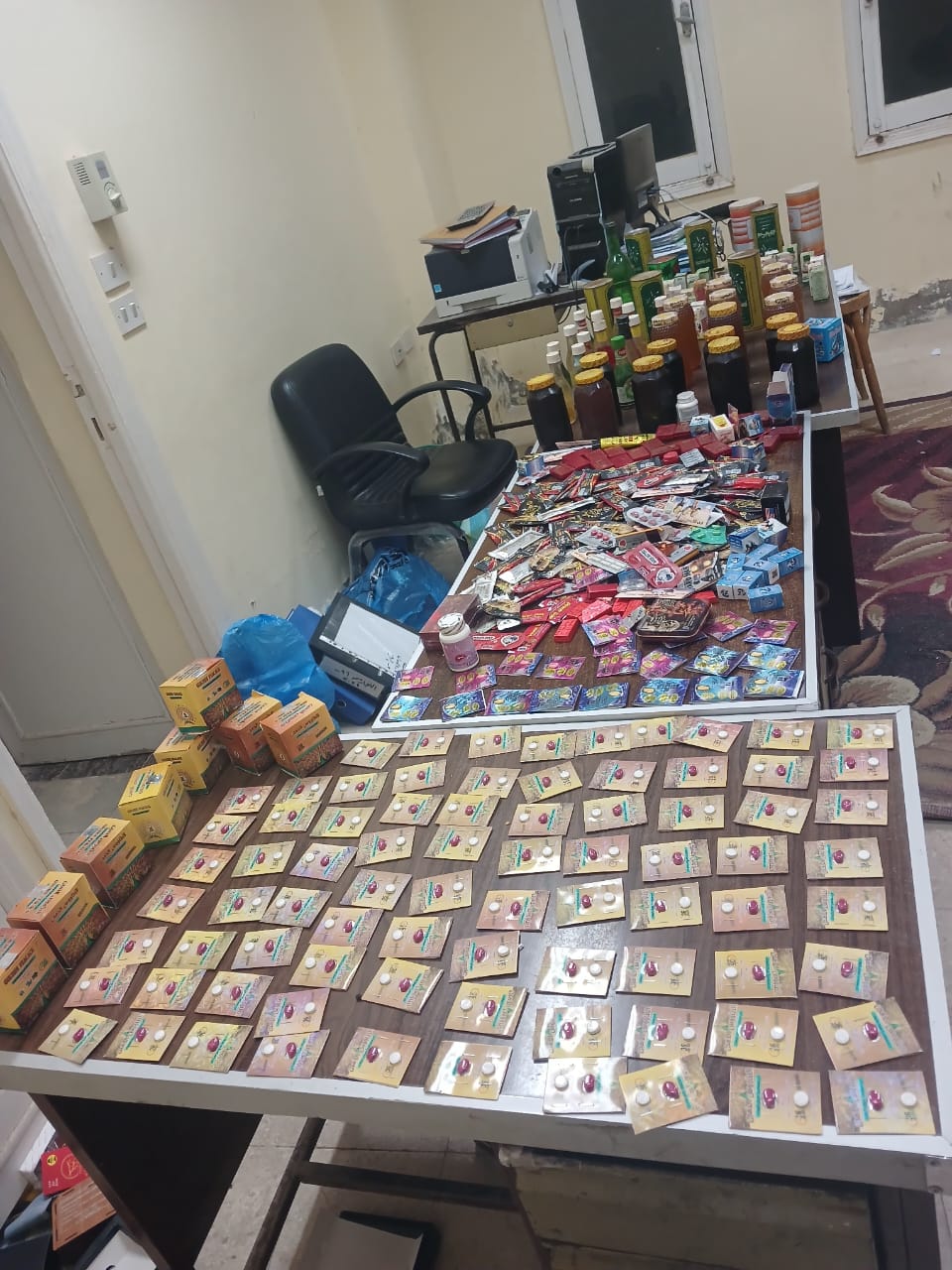كما تم التحفظ علي 30 عبوة منتجات عنايه شخصية منتهية الصلاخية، و17 عبوة عسل أبيض زنة العبوة كيلو حرام واحد، بدون أية بيانات تفيد تاريخ الانتاج أو جهة المصدر أو مدة الصلاحية، و130 عبوة زيوت شعر وكريمات بدون تواريخ الإنتاج، و2700 قطعة شيكولاته منتهي الصلاحية، و540 كيس لوليتا مجهول المصدر، و68 علبة سجائر مختلفة الأنواع مجهولة المصدر.