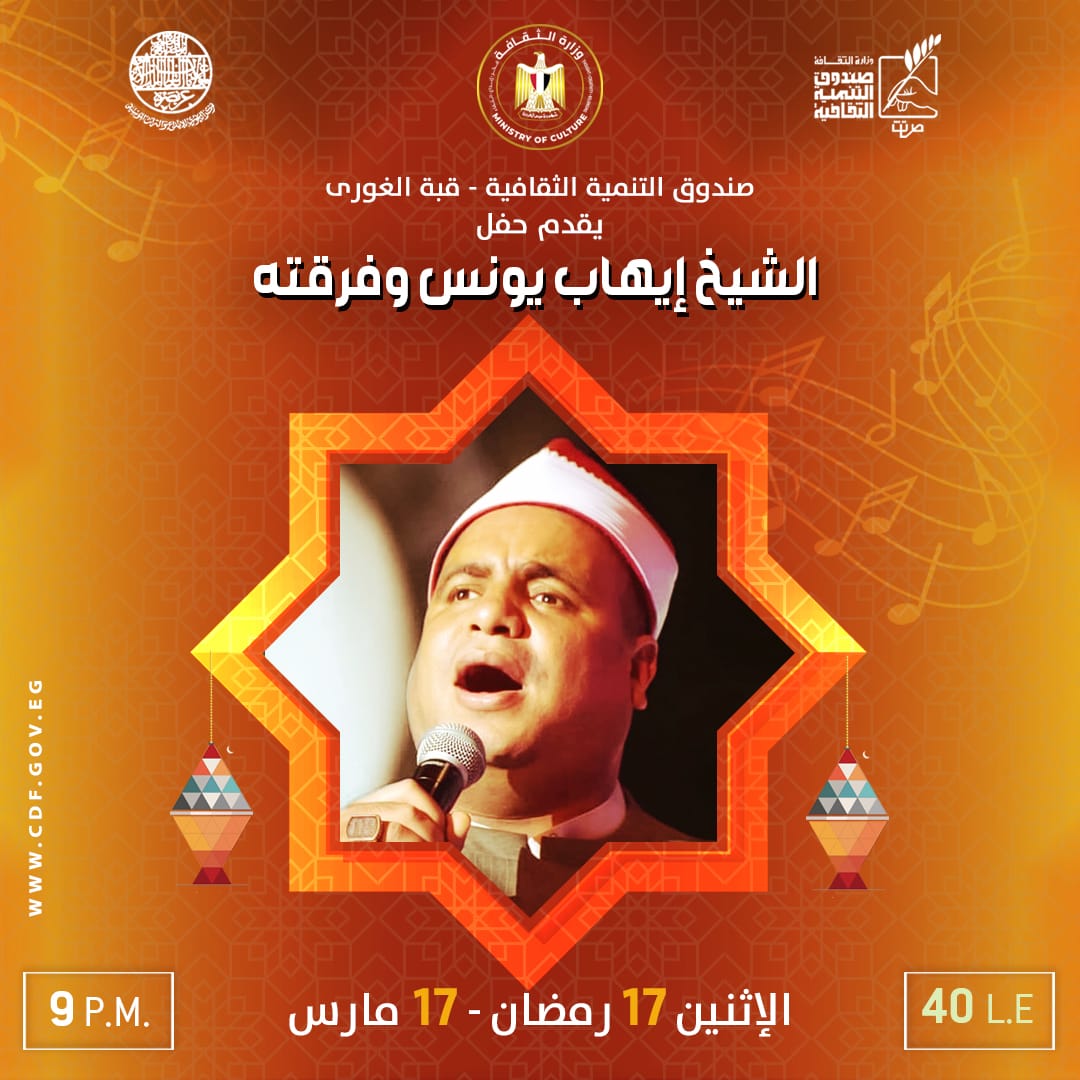 يواصل قطاع صندوق التنمية الثقافية تقديم برنامجه الرمضاني الحافل، حيث يشهد يوم الاثنين (17 مارس – 17 رمضان) مجموعة من الفعاليات الثقافية والفنية المتميزة، التي تحتفي بالموسيقى والتراث في أجواء رمضانية خاصة.