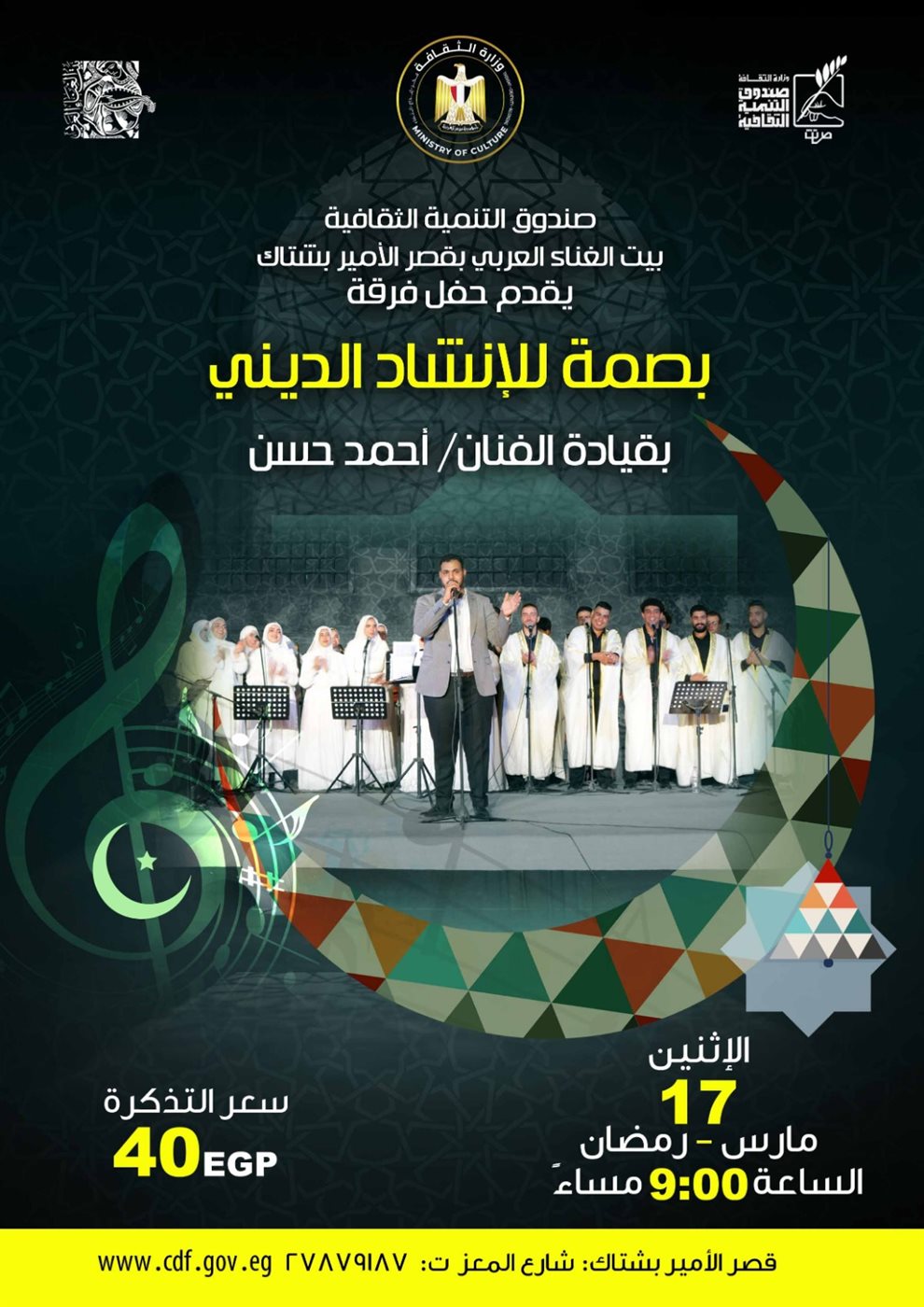 وفي بيت الغناء العربي (قصر الأمير بشتاك) بشارع المعز، تستضيف القاعة حفلًا لفرقة "بصمة" للإنشاد الديني، بقيادة الفنان أحمد حسن، حيث تقدم مجموعة من الأعمال الإنشادية التي تمزج بين الطابع التقليدي والأسلوب الحديث في الأداء.