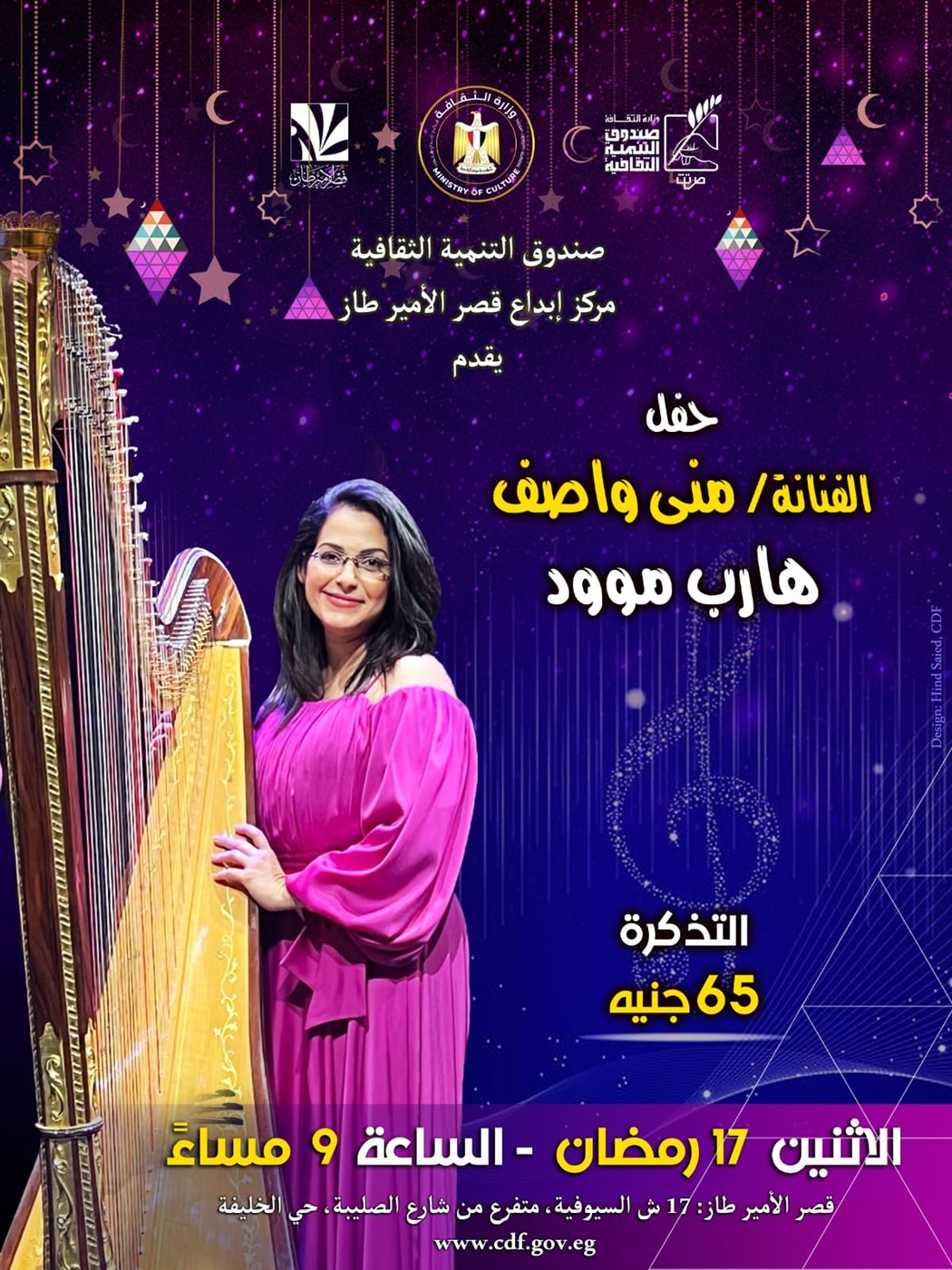 أما قصر الأمير طاز بالخليفة، فيشهد أمسية فنية جديدة بعنوان "هارب مود" لفنانة الهارب دكتورة منى واصف، تقدم خلالها مقطوعات ساحرة على آلة الهارب، تجمع بين الأصالة والمعاصرة.