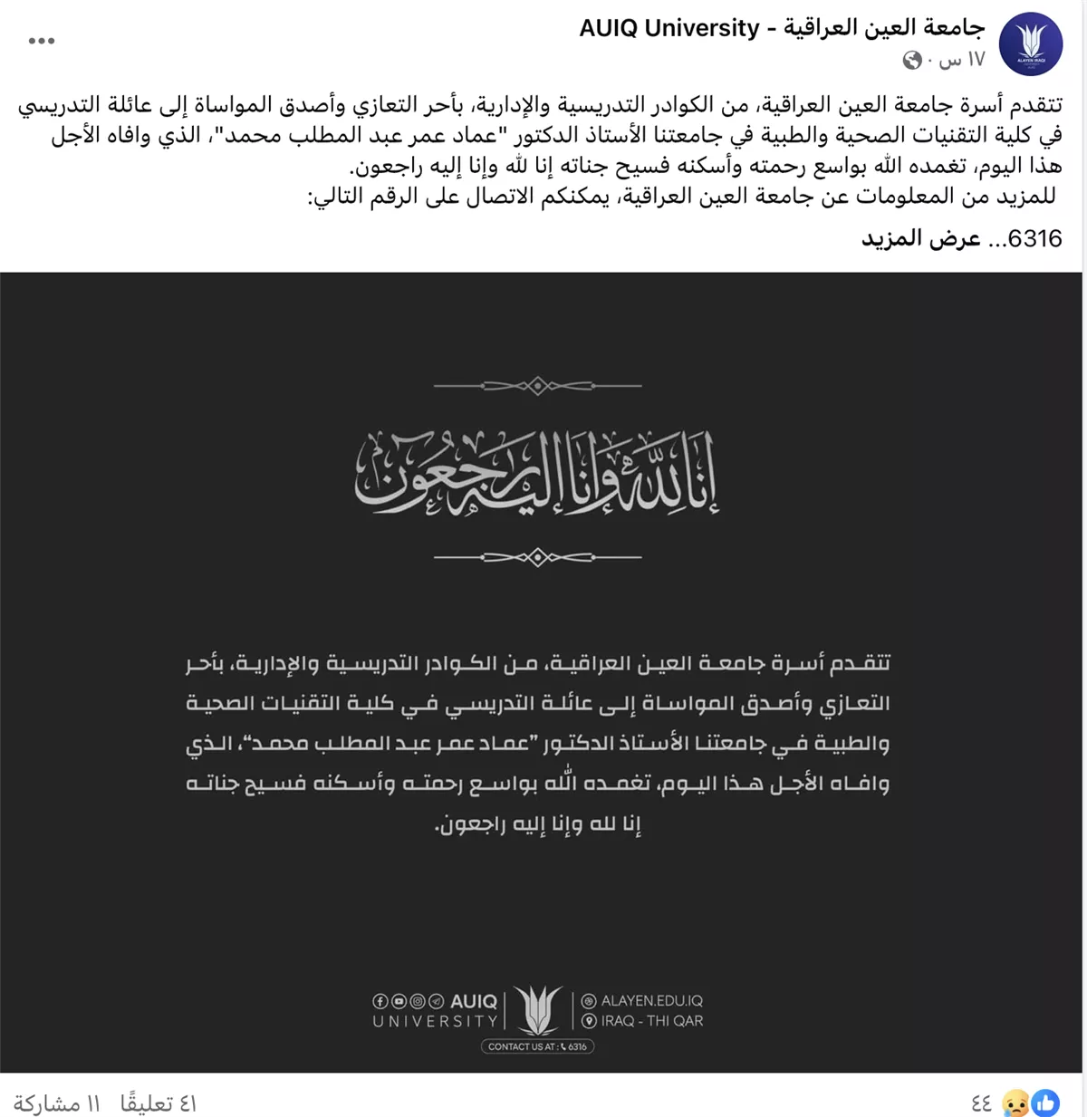 ونعت جامعة "العين" العراقية، المدرس في كلية التقنيات الصحية والطبية في الجامعة، "عماد عمر عبد المطلب محمد"، وقدمت المواساة لعائلته.