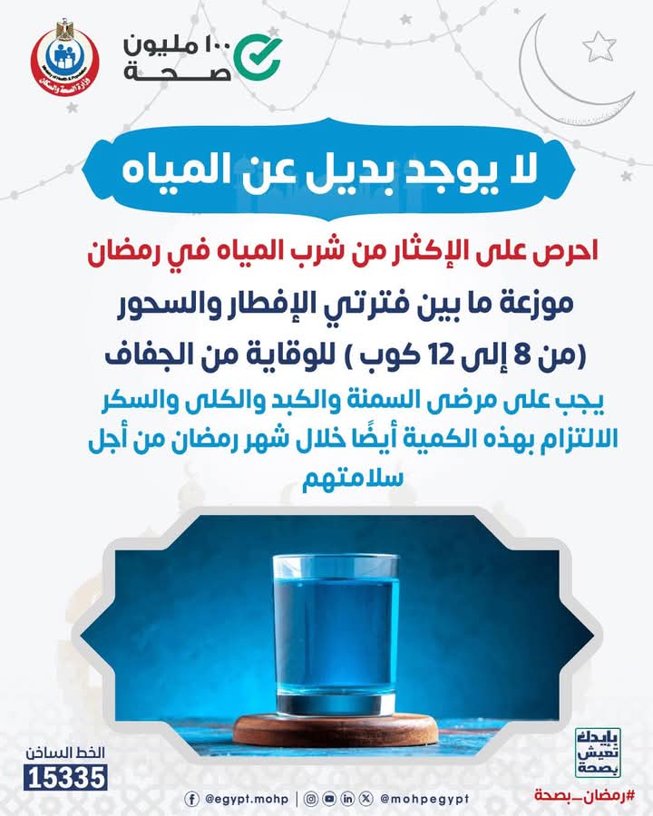 من جانبها قالت وزارة الصحة أنه لا يوجد بديل للمياه لذلك يجب الحرص على شرب من ٨ إلى ١٢ كوب من المياه في الفترة بين الإفطار والسحور للوقاية من الجفاف.